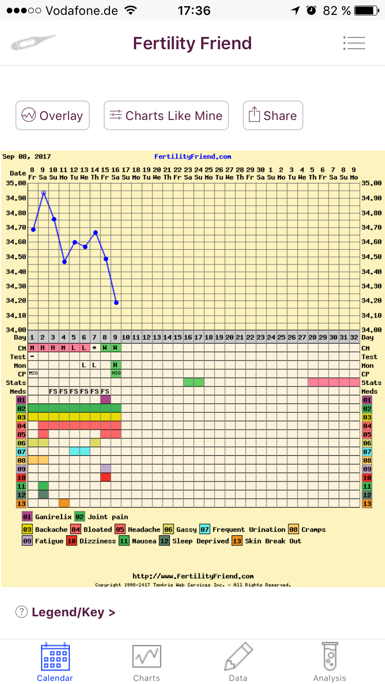 WAYDTGKU PNV CoQ10 BBT CM CP OPK CBAD no caffeine no alcohol no gluten (semi-paleo) limited sugar (other than in my birthday cake yesterday ;-)) Plus for IVF cycle 1 day 7 of 225 every night of Pergoveris (Stimulant) and day 2 of Orgalutran (Ganirelix - every 18 hours to prevent early ovulation)