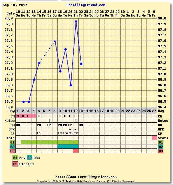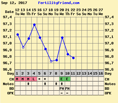 @dukestar5 - Pfft. I have no idea what we're doing this weekend, lol. I know we're visiting friends and getting more dirt on some ridiculous behaviour that MIL had last weekend, but that's it. Also, 10 mile run makes you my hero! Awesome! @zamora_spin - I hope your weekend is relaxing, even if you're still doing some work! @SkilledSailor - Have fun this weekend! School is going good. Planning on getting ahead on homework this week to make things a little easier on me. Not sure how it'll go. @krashke - Based on your chart, I wouldn't assume O date was yesterday. Nothing indicates yesterday was O day other than a little EWCM, and you should have more fertile CM leading up to and on O day than one instance. I'd definitely chart the EWCM for yesterday, though, as you're supposed to chart the most-fertile CM you see throughout the day, even if it doesn't occur every time you check.