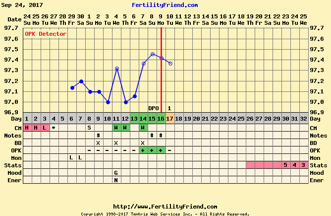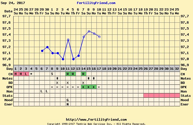 @mygoodlucycat First of all, what are the open circles for CD 14-17? Second, FF will give you CHs after 3 days of elevated temps. Today may be O and you may see a spike tomorrow morning. A lot of people O the day after the last +OPK. I would keep HIO and charting and see if you get a temp spike.