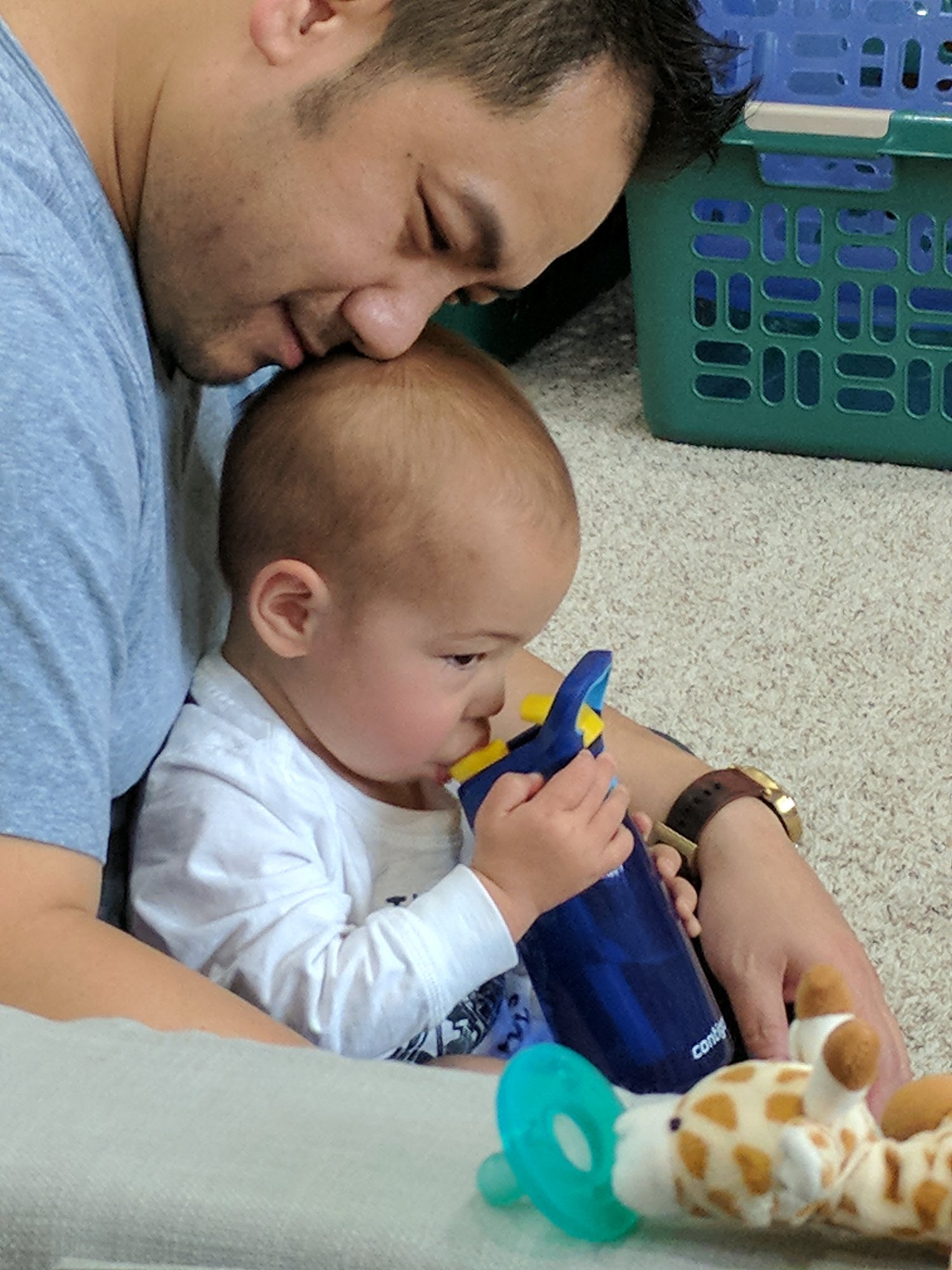 Well to urgent care we went today and Tristan ended up with a right ear infection along with pink eye.  He has really been a trooper for the most part.  Here he is cuddling with his Papa and drinking water.