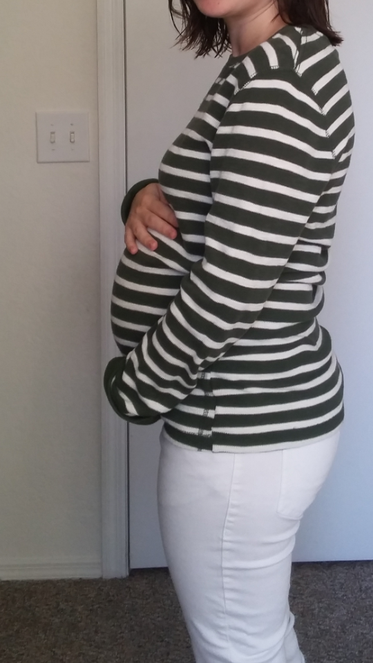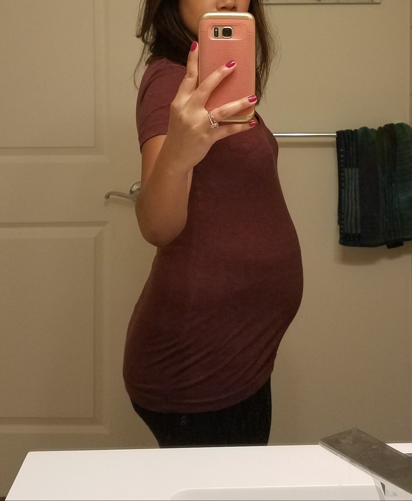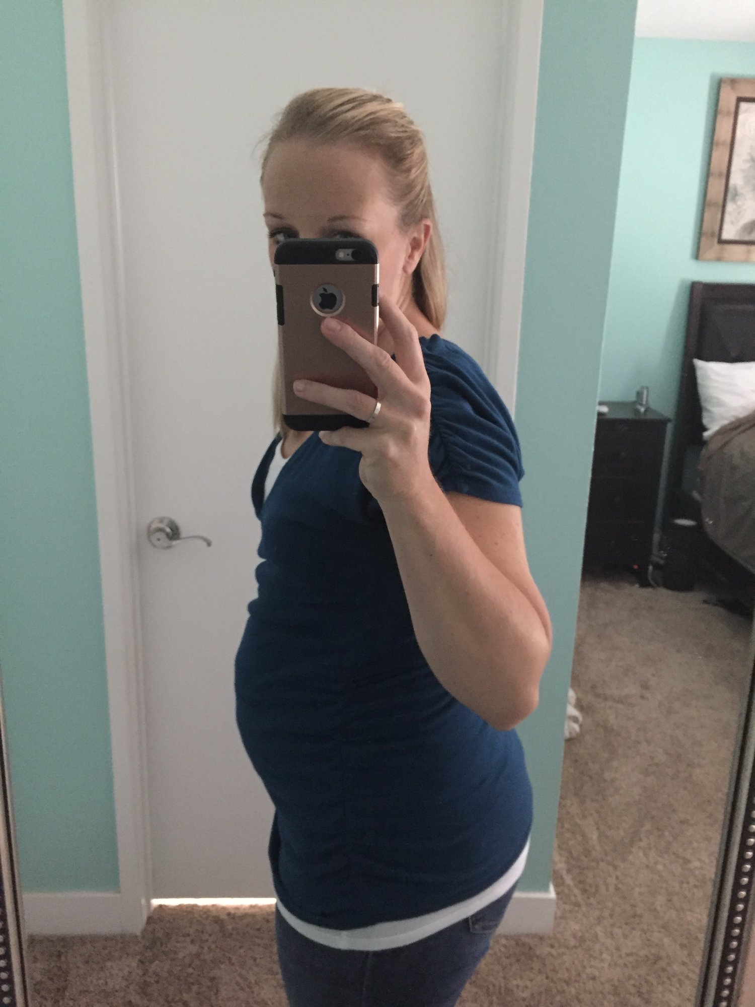 24 weeks today with baby boy! I would just like to point out that this shirt was a staple until literally the day I gave birth to DD. It looks like it is hanging on for dear life at 24 weeks with DS. Oy.