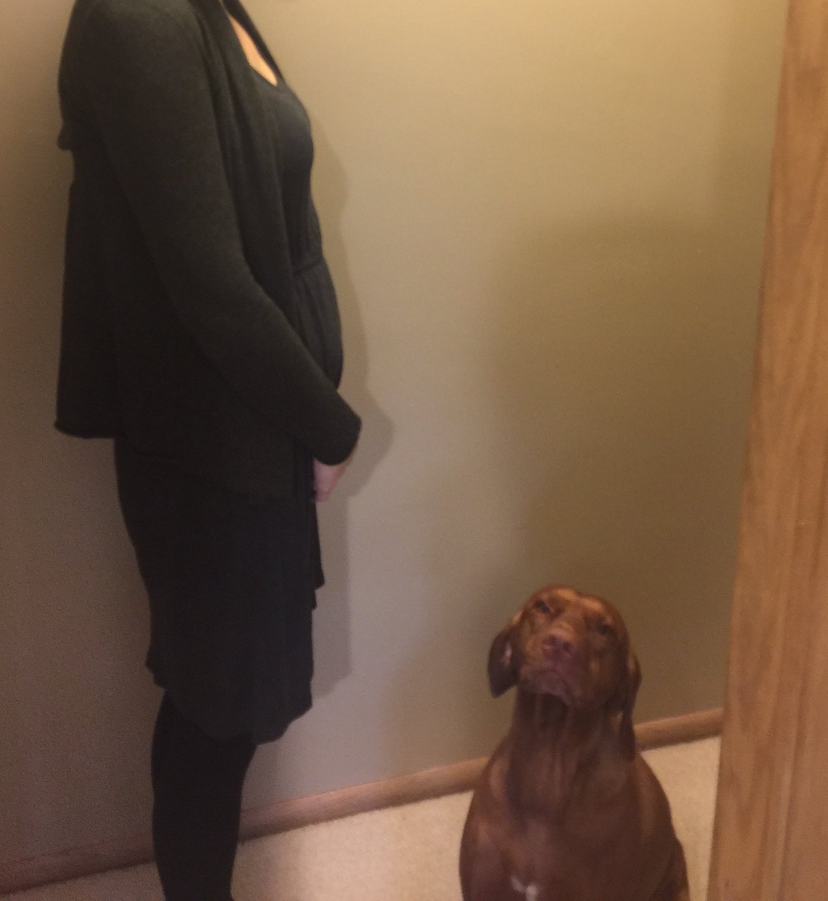 I apologize for my terrible hand placement.. This was taken last week when I was 17 weeks along. I've definitely popped out more this week, but I mostly wanted to share this picture because of our dog.