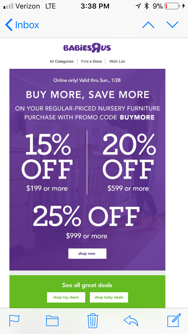 @JJMNO1616 BRU sends out a small catalogue with a 20% off coupon every month, which I believe you get upon signing up for a rewards account. So you wouldn’t even need to start a registry to get that coupon. If I recall, though, the coupon excludes toys and clothes but does include furniture. So you’d be all set!