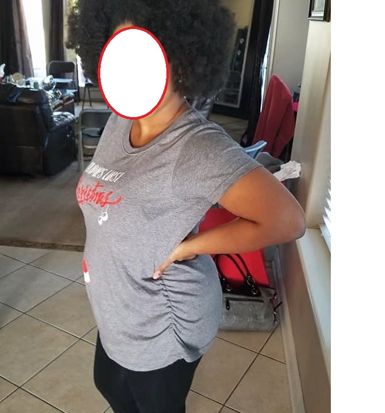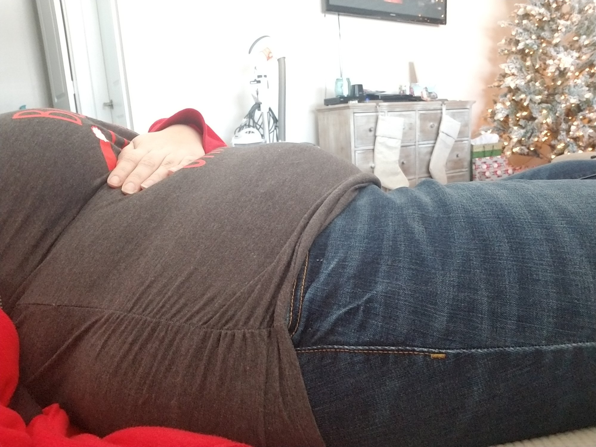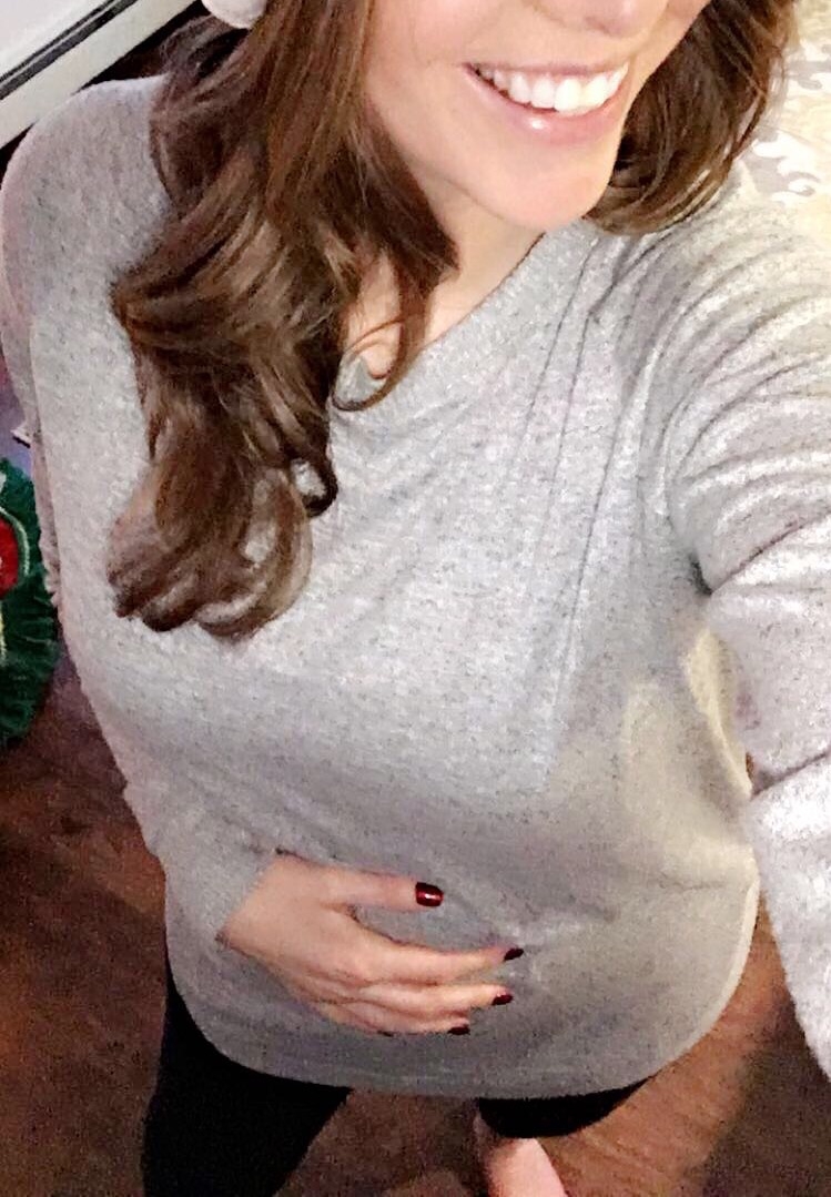 Me on Christmas. 16 weeks. Wearing a "Bump's first Christmas" shirt. I actually purchased a "Best Gift Ever" shirt to wear (I'm not a fan of calling my son "bump") but my step mom gave me this and was really excited for me to wear it (it was also a size too big). I wore my Best Gift Ever shirt the day after Christmas and I think it was still appropriate. As a side note I took another picture holding the bottom of my stomach and I looked so fat, so I won't be doing that for a while until the bump it bigger.