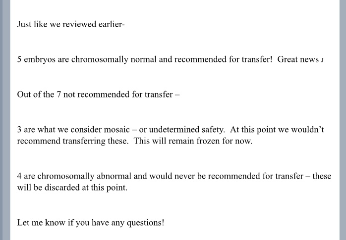 Got my PGS results back! Out of all of those eggs 5 were normal , 5?!?? I was kind a hoping for a couple more… don’t get me wrong. I am very happy for the 5 normals!