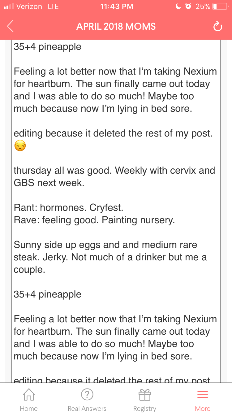 How are you feeling? I had the worst acid reflux every yesterday. It started in prenatal yoga. I made the mistake of going to class without eating or taking my evening dose of acid reflux medication. The worst part was that after I got home, took my medicine and ate, the bad acid reflux continued all night. I kept waking up with acid in my throat on the verge of tossing my cookies.