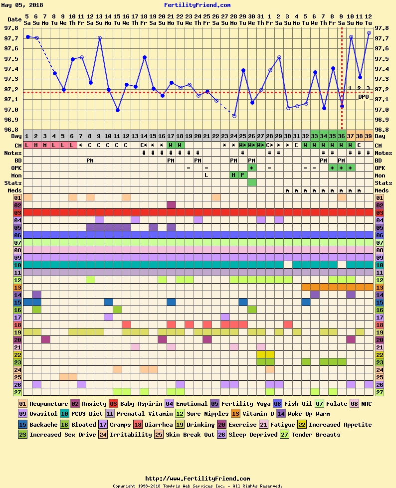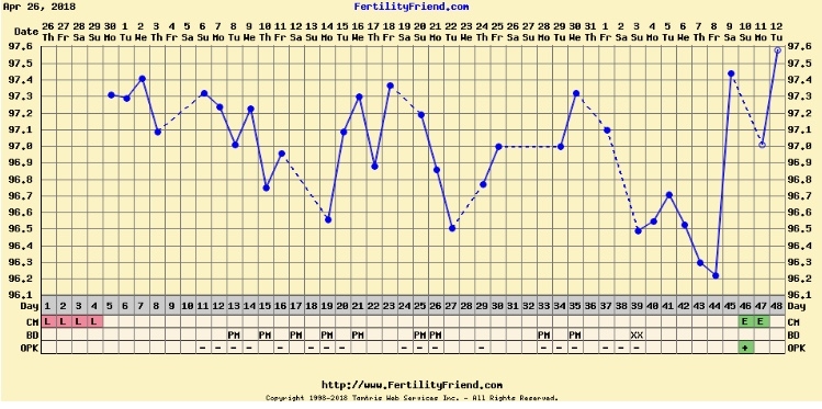 R/R: Of course the day I really needed an accurate temp I woke up at 4:45! I took it then and then went back to sleep and took it at normal time, but of course there is a big difference between the two. *sigh* One will give me dotted CH's and one won't. I went ahead and left the one at my normal time in there. I'm sure it doesn't really matter at this point anyways.