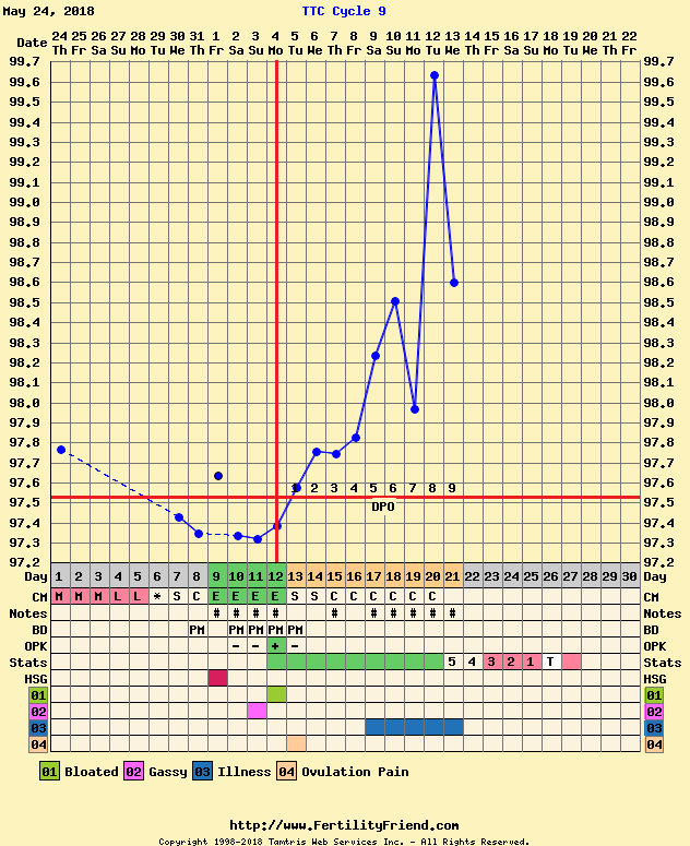 Timing: -5, -3 (assuming it's a confirmed O, see chart for reference). Not sleeping in the same bed for 10 days is taking its toll. Our timing is not great and I'm pretty bummed about it.