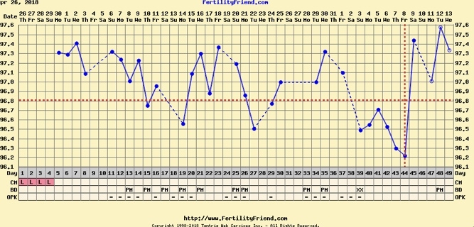 CS/Q: I had what I thought was a positive OPK (I have the cheapies and am still new to deciphering them) on CD 46, but that was the only one I’ve done recently. When I took that out of FF, the beautiful crosshairs appeared! Hoping my temps stay consistent and at this point hoping for AF before my OB appt next week so I have more of a confirmation before talking to my doctor.