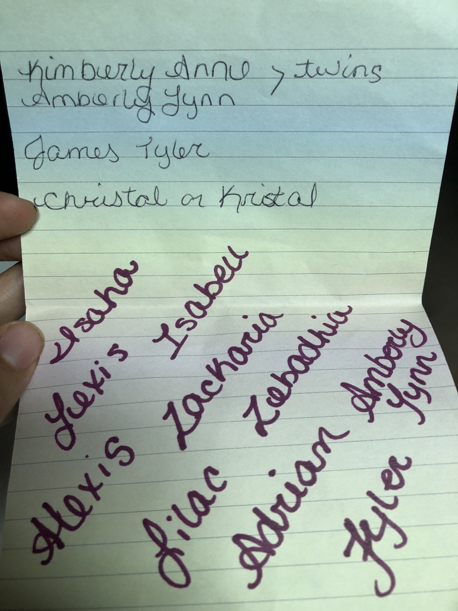 For twins I wanted Kimberly and Amberly when I was little (those were my best friends mom and sisters names haha). Other names have included Xavier, Alexandria, Jessie(girl), Jaylah, Andres, Ayden. Last pregnancy too two picks for most the pregnancy were Violet and Asher.