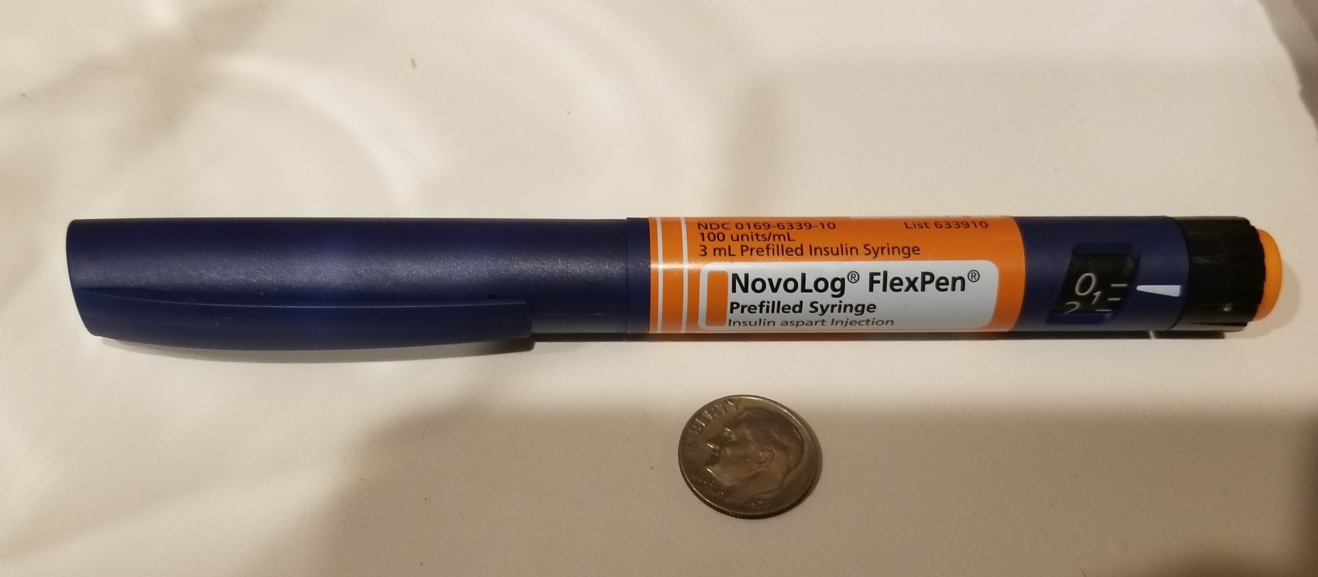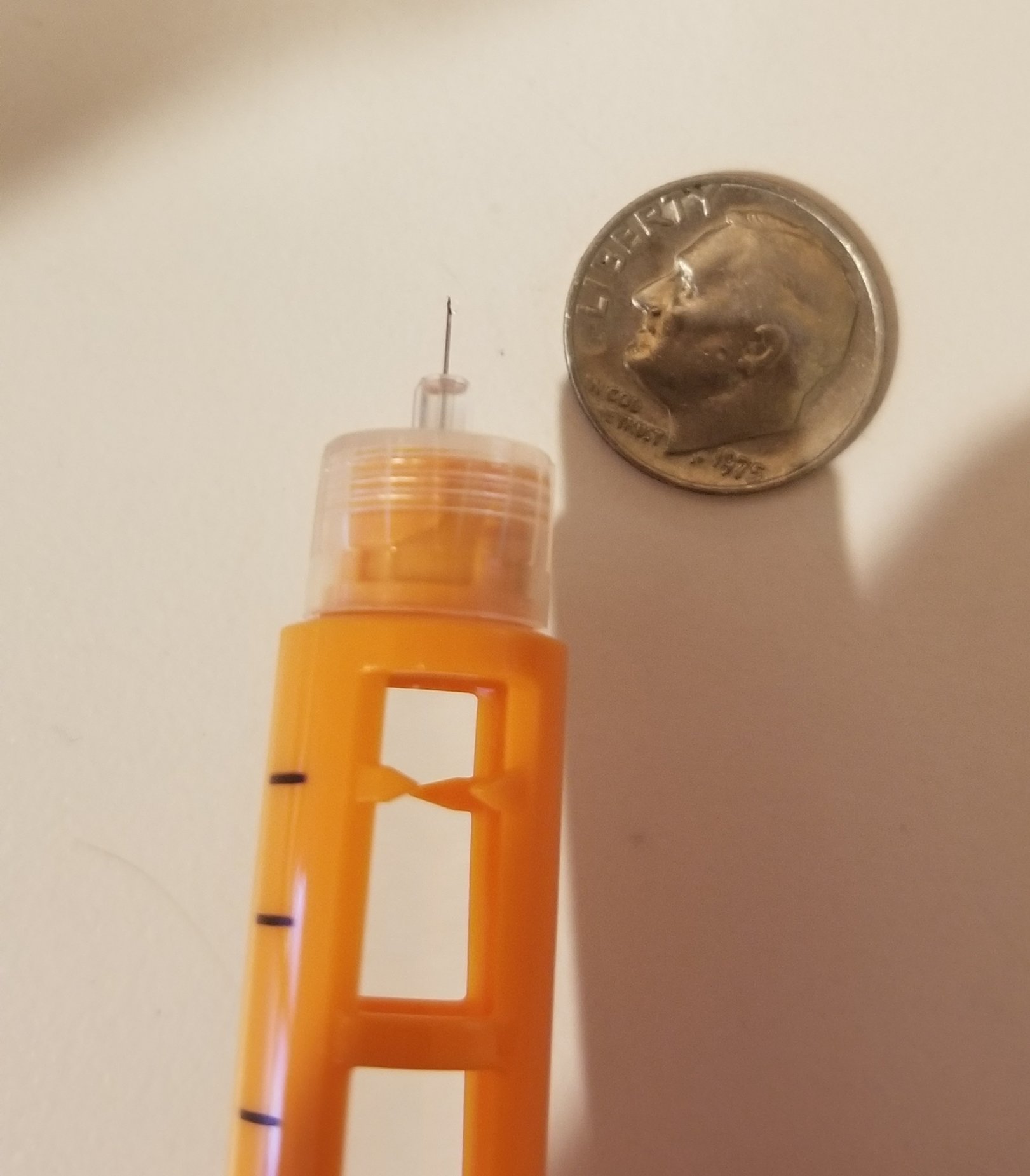 I'm putting a pic of my insulin pen and the needle in spoiler. Dime is there for size reference.