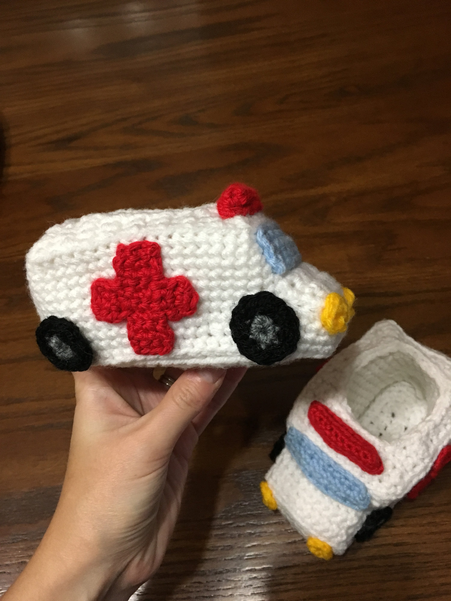 I did make a newborn hat as soon as we found out we are expecting but I haven't taken a picture yet. Before that I made Ambulance slippers! I had a friend ask if I could make some for her son after I posted a picture of another pair of slippers I had made. I couldn't find a pattern so after a couple months of experimenting and a lot of frustration I finally came up with something! It's probably one of the projects I'm most proud of so far!