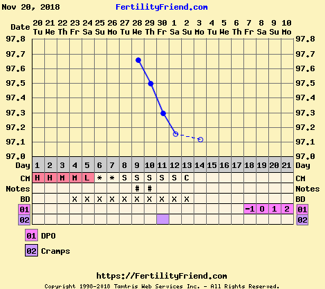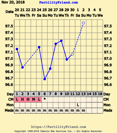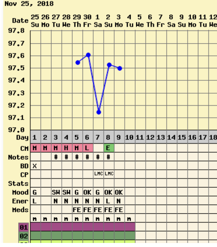 CS/Q: None right now. My chart is a hot mess...I've gotten about four uninterrupted nights of sleep since I decided to start temping again.