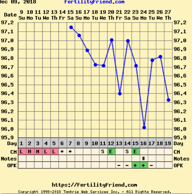 CS/Q: I have no clue what my chart is doing. Positive OPK CD 16 but no temp rise. So either I haven’t ovulated yet or my temps are inaccurate. Which is definitely possibly because my BBT is pretty old and I’ve been really restless at night due to some pain recently. Should I keep taking OPKs?