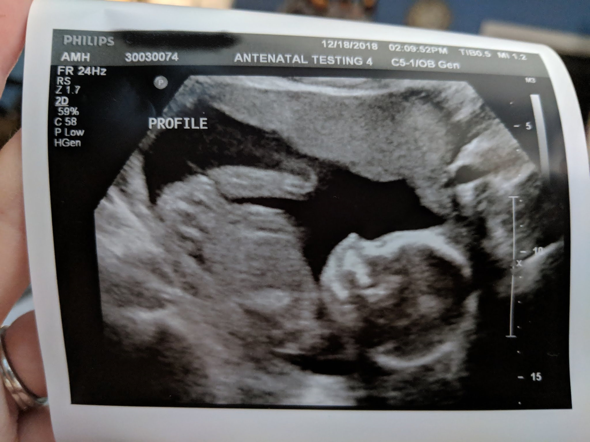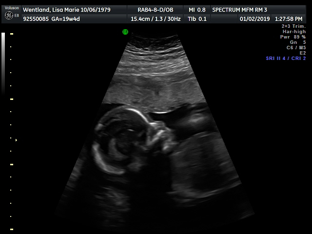 Baby #3. I had my anatomy scan on Jan 2 with the maternal fetal medicine doctor. He's currently breech and facing my spine. The scan took a while, but all looked good enough to cancel my consultation with the doctor afterward. Due to age, and other risk factors, I go back in for another ultrasound in 4 weeks to check growth.