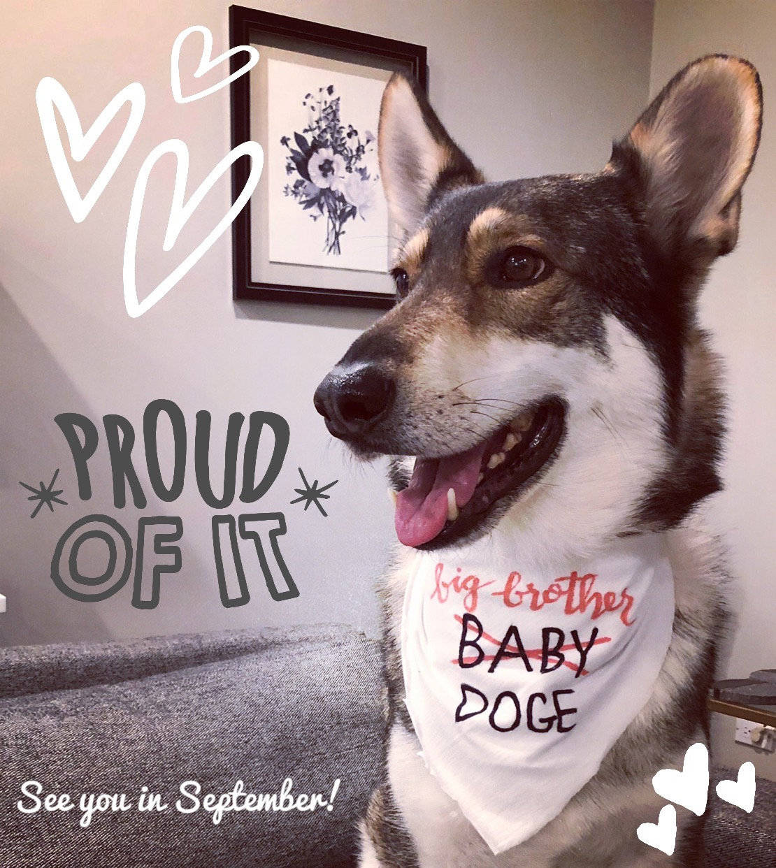 My close friend/coworker actually found out before DH did. I got a BFP on a digital but wanted to wait until it was confirmed by a blood test. DH wasn't home so I immediately called my friend (he knows we've been TTC) freaking out. My doctor called this morning at work, but I was in the middle of teaching and couldn't answer. I was too afraid to read the voicemail transcript so I sent my phone to my friend's classroom to check for me . When DH came home, I had our dog in a bandana I made. I always call him "baby doge," and H always says he's a full grown doge. Now he's going to be a big brother! H didn't get it right away; he thought I had made the bandana just for fun. I took a video of the whole thing, and H's face when it finally dawns on him is priceless!