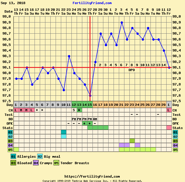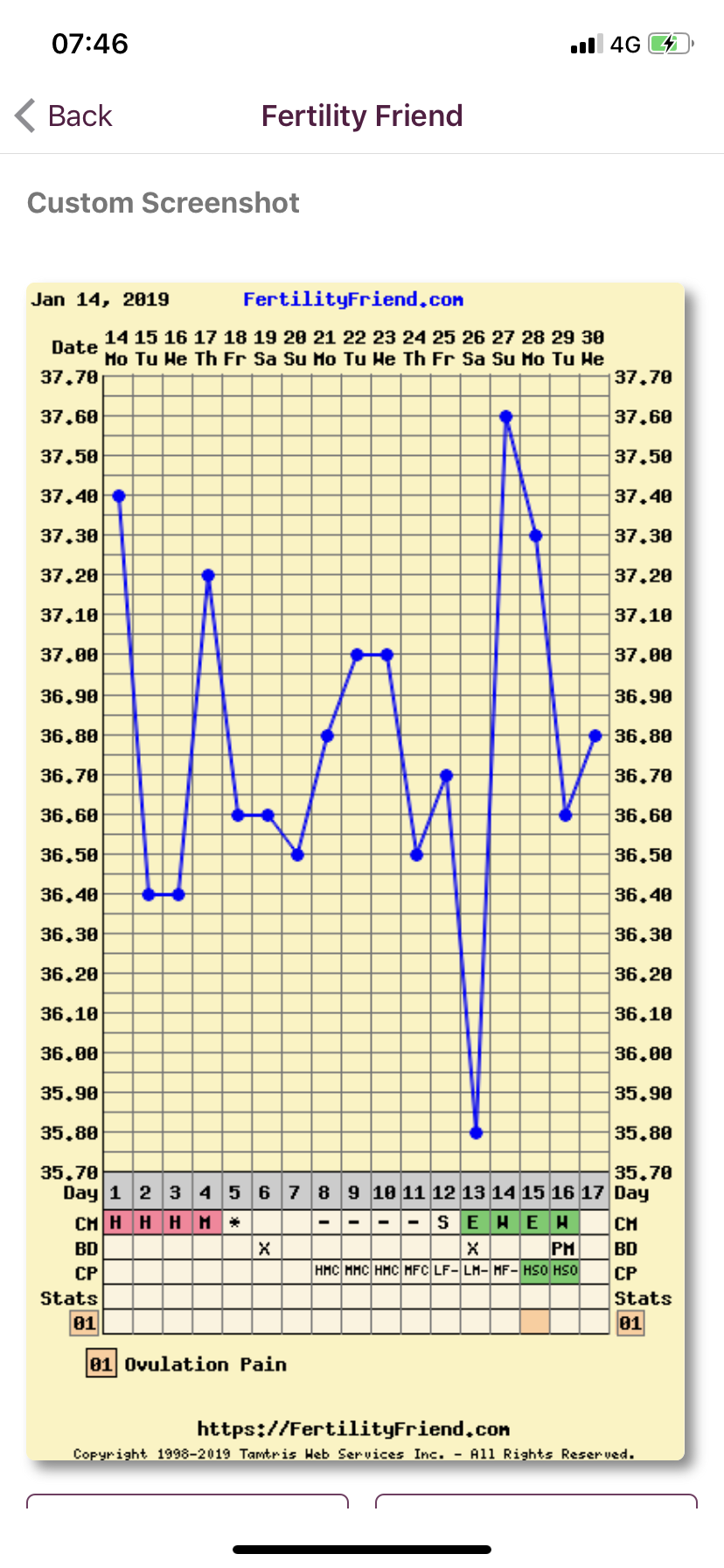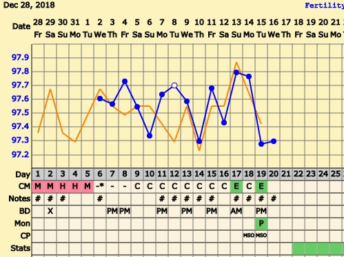 @jackie_dunny I wouldn't be surprised if FF doesn't give you CHs because your temps are so erratic. Are you taking them at the same time every morning after at least 3 hours of sleep? I know you recently got a new puppy so I'm not sure if he's still waking you up every so often. If you're not, I would suggest trying to do so as it will make your chart easier to read. Also, OPKs can be a great resource that will help tell you when O is coming up. Finally, FF needs 3 days of elevated temps to give CHs so even if you did O on CD15, today is only CD17 and the earliest you would get CHs would be after tomorrow's temp.