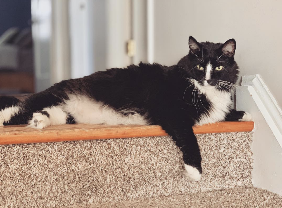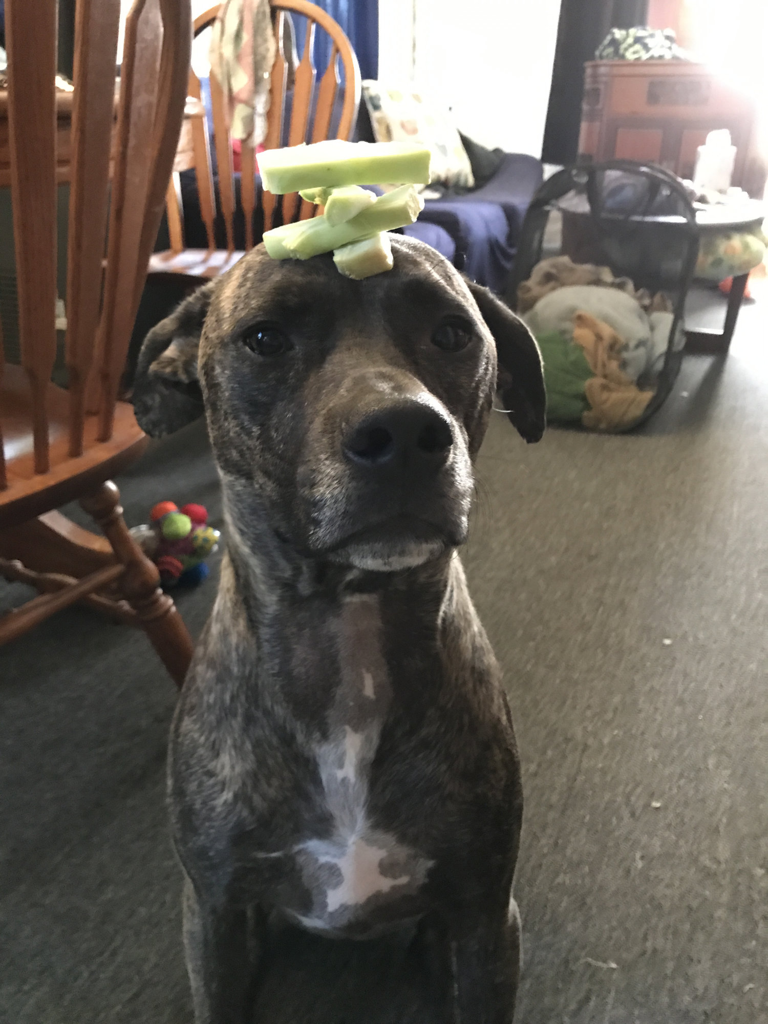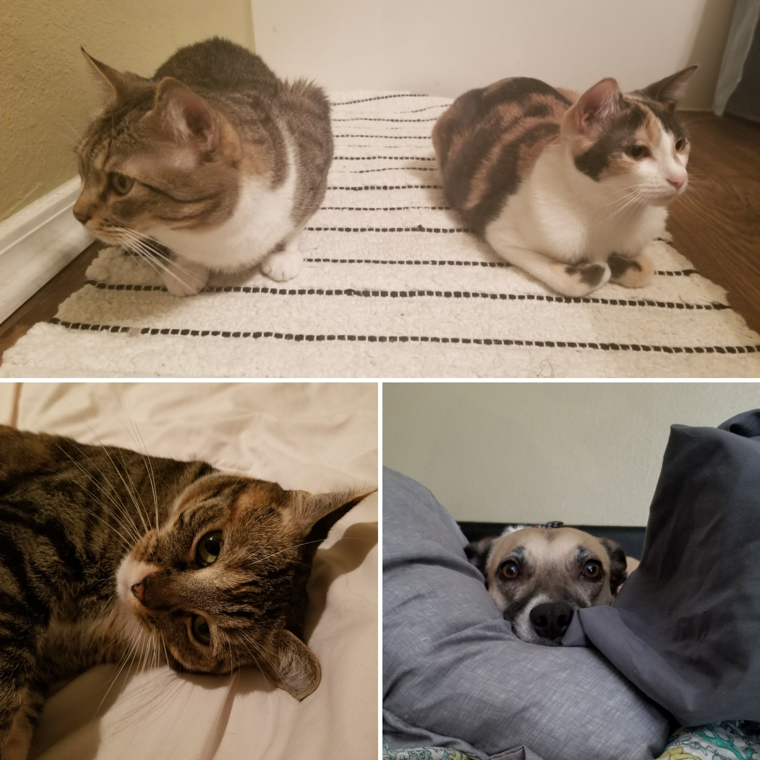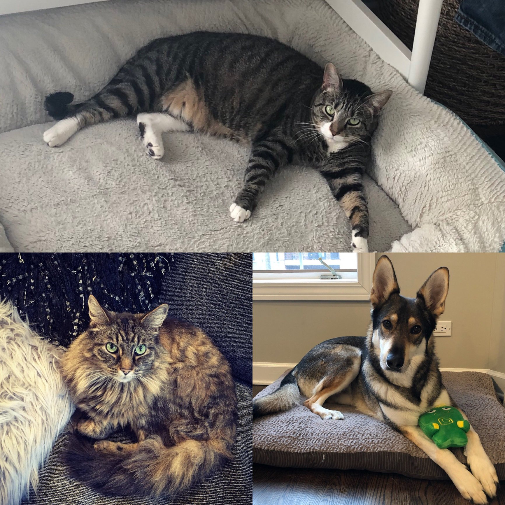 We’ve got three fur babies - Stella (top) and Duke (bottom), two grumpy old cats that H had before we met, and Monty, a 4 year old pit mix/giant baby. Those are broccoli stems stacked on Monty’s head - he will sit very still for broccoli treats!