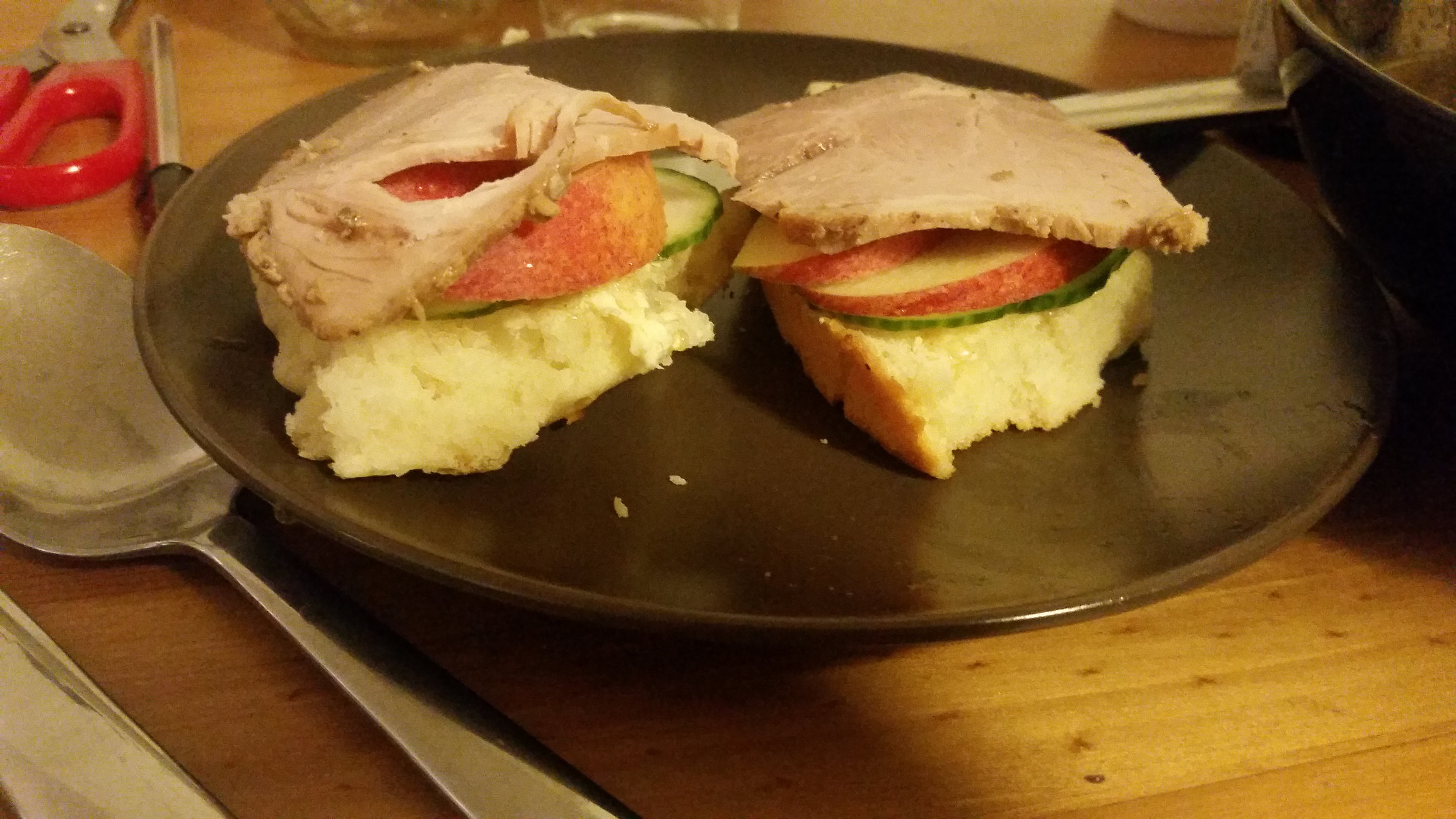 First sandwich in about 11 months did not disappoint. (1st attempt at homemade bread was fairly successful....a gluten free recipe that's also egg free was so hard to find that I subbed the eggs out. It was ok, but a bit sweet and dense so im still on the hunt for a sandwich bread recipe,  but it was ok to start....). Topped with margarine, spiced peach jam, cucumber, apple, and roasted pork. I think I'll do the same tomorrow plus bacon.  *drool*