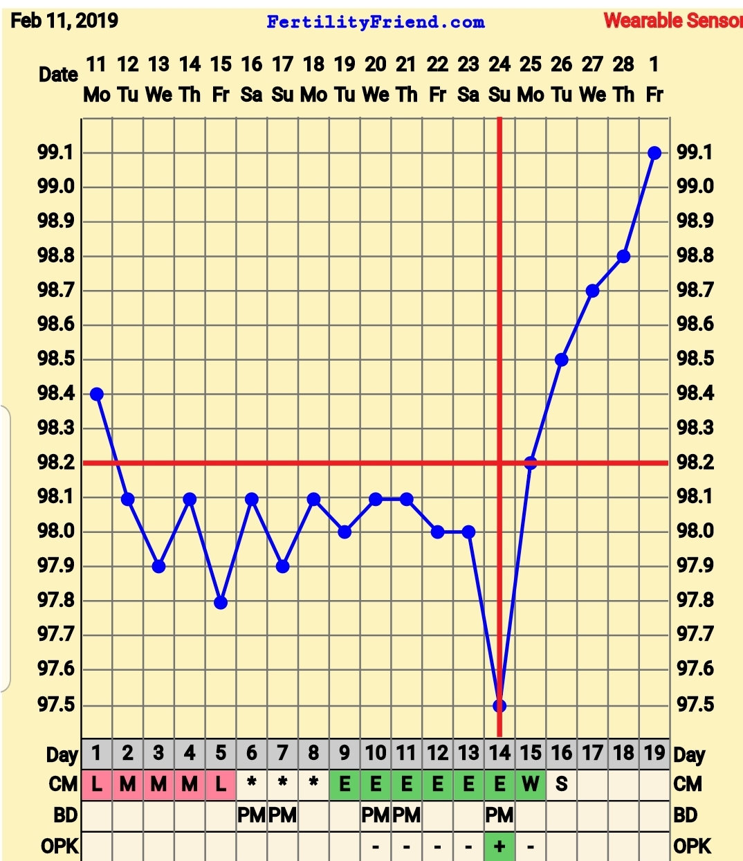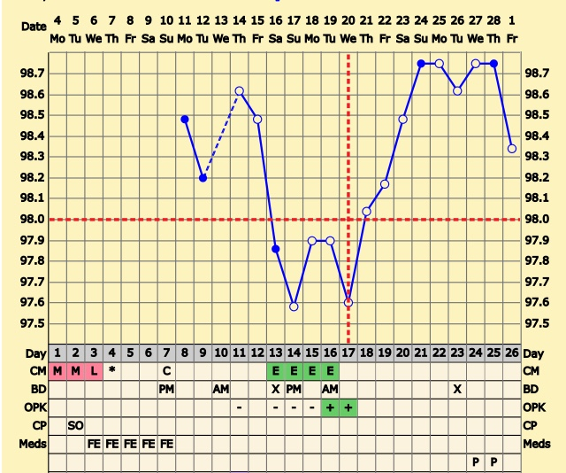 CS/Q: Since I’m past my usual luteal phase and temps haven’t dropped that much, wondering if I either O’d later than FF thinks or if I had a LUF. Any thoughts? I’m on nights now so my last 2 temps are open circles.