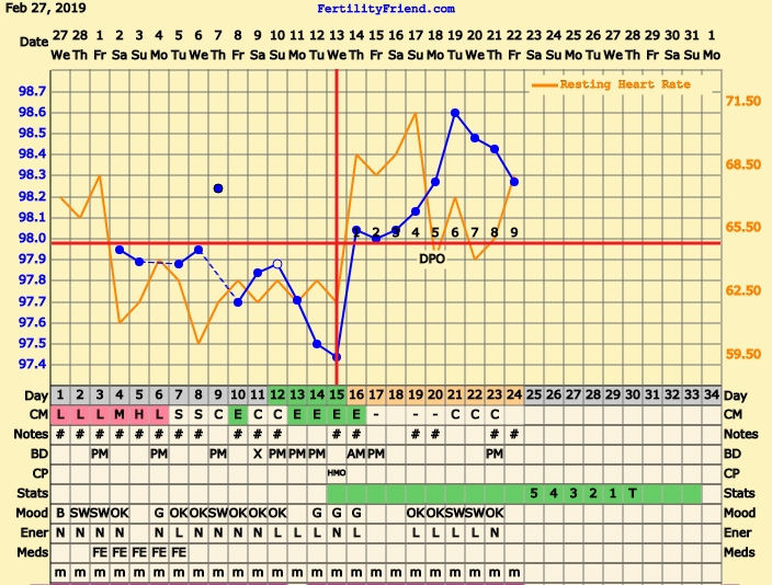 Testing: Potentially tomorrow, we'll see how I feel in the morning. My temps are on a steady decline which is unusual for CD9.
