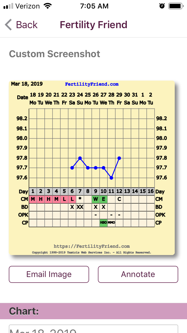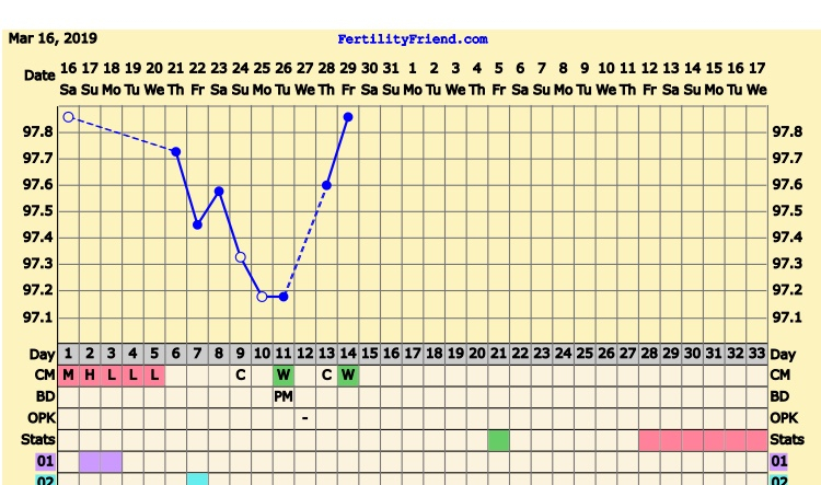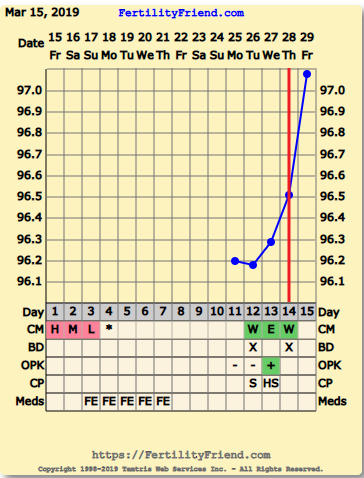 CS/Q: Pos OPK Wednesday, and temp shift today. FF game me a single vertical line (was dotted vertical line yesterday), but I'm going to wait a few more days to see a good shift before I'm ready to believe that I'm in TWW. FF probably didn't like that I had so few temps, plus this is an "early" O for me (likely due to Letrozole) **Please don't kick me out of WTO just yet**