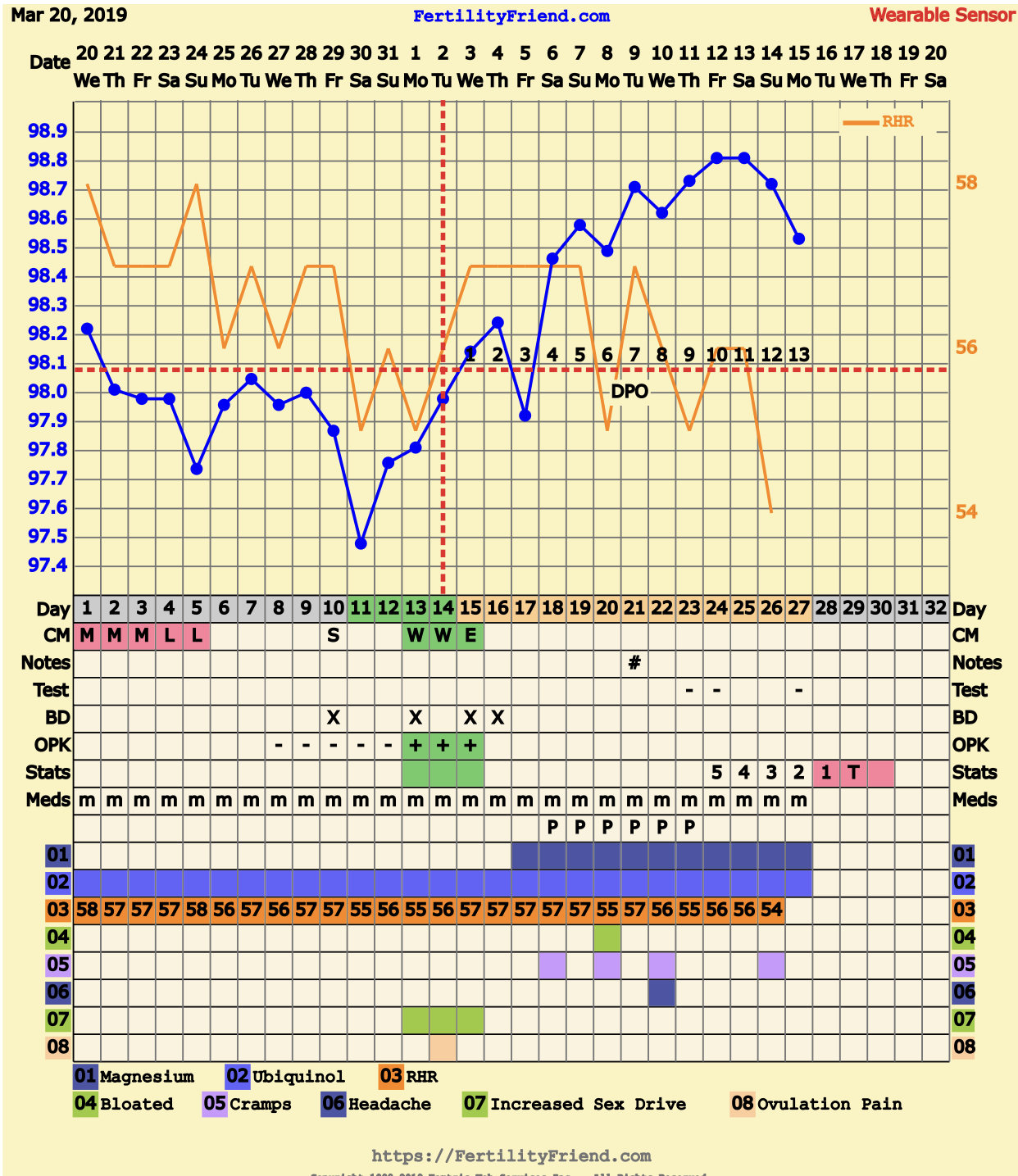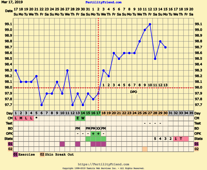 CS/Q: I know the best way would be to post my chart but I'm still figuring out the best way to do that. My question is when do you consider O. Is it a) the first day of the temp spike (opks go lighter) b) the day before the temp spike (opks are dark). My chart is usually very consistent with having a low temp then 3 clear high temps. This cycle though I never had a true dark OPK. Any insight would be great