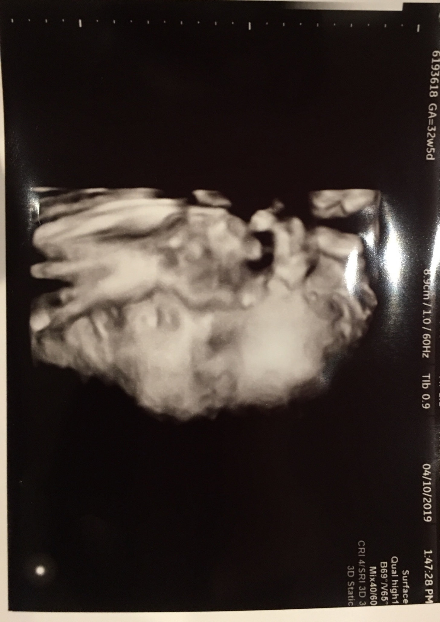 32 week scan went well. Things looking good but baby’s head and abdomen are measuring 4 weeks ahead at 36 weeks!! Limbs are on track. Estimated weight is 4 lbs 9oz or 72% percentile. Oye ve!! My vagina weeps. Little one also didn’t cooperate and didn’t show her face so no good 3D pics, but this cute one with her hand/arm in front of her face. Maybe she’s embarrassed we’re already commenting on her weight. Lol