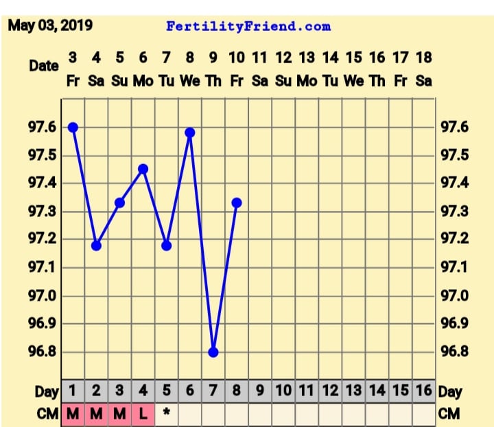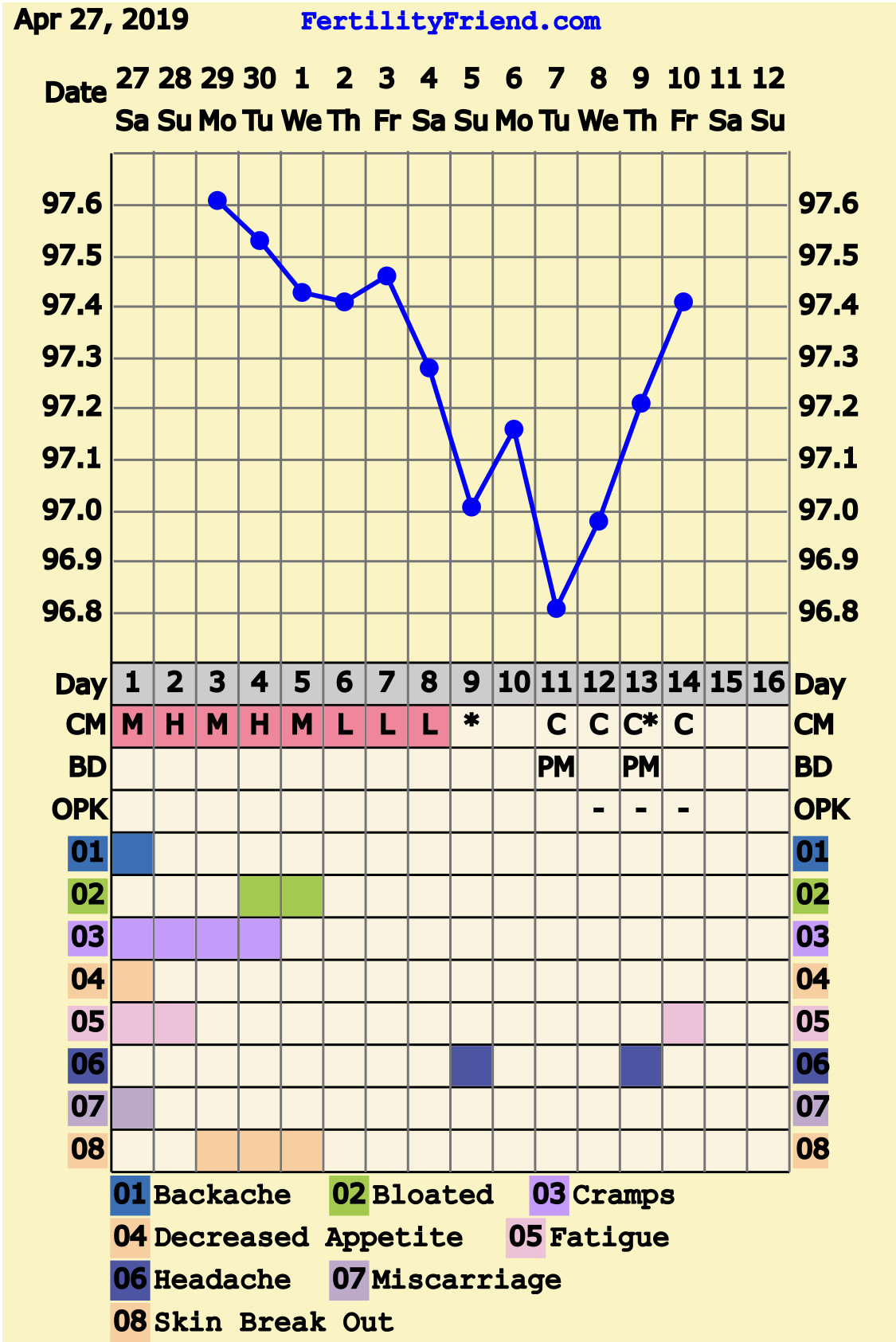 CS/Q: https://www.fertilityfriend.com/home/5d321c FF gave me cross hairs this morning with my high temp but I am positive it is wrong and will change. I am almost certain O was CD 14 or 15, but I'm thinking 15 because I had O pain. I am also pretty sure my temp was abnormally elevated because I woke up an about 1 hour and 45 minutes before my alarm and then went back to sleep and woke up 1.5 hours later and took my temp. Our timing will suck, but did manage to FWP last night. I probably will move over to the TWW tomorrow if my temp is high again.