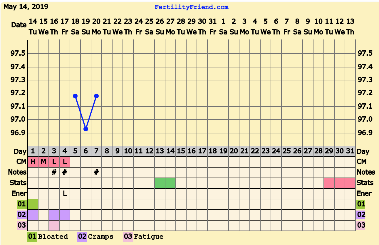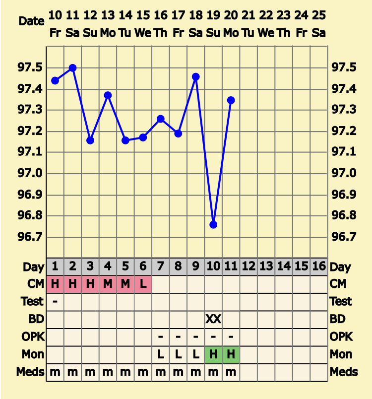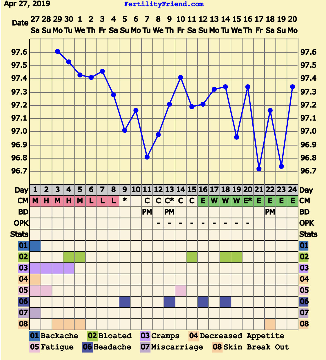 CS/Q: I did not temp while traveling and took my first temp of the month today and it was above coverline. However, I did wake up from 4:30-5:00 because my brain hates me so not really the temp means anything. I have been O’ing around CD21-23 so we will see what the pattern does. I am out of OPKs and think I’m going to skip bothering with that this month because I just have so much going on.