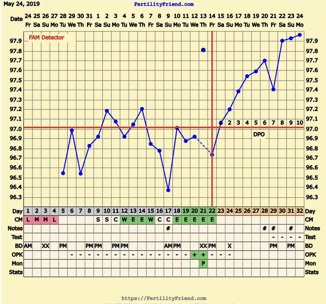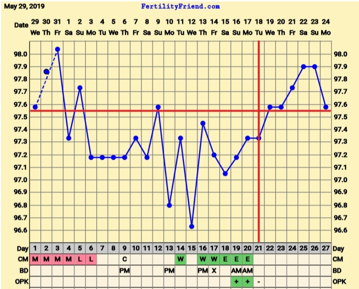 CS/Q: I'm a temping failure this cycle, and I'm not sure why FF is saying that I O'd the day after my first +OPK even thought I got another +OPK the next day... you'd think it would say the day after my last positive. Either way, any uncertainty is my own fault for not temping well enough.