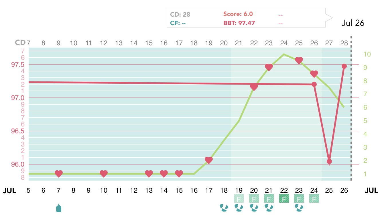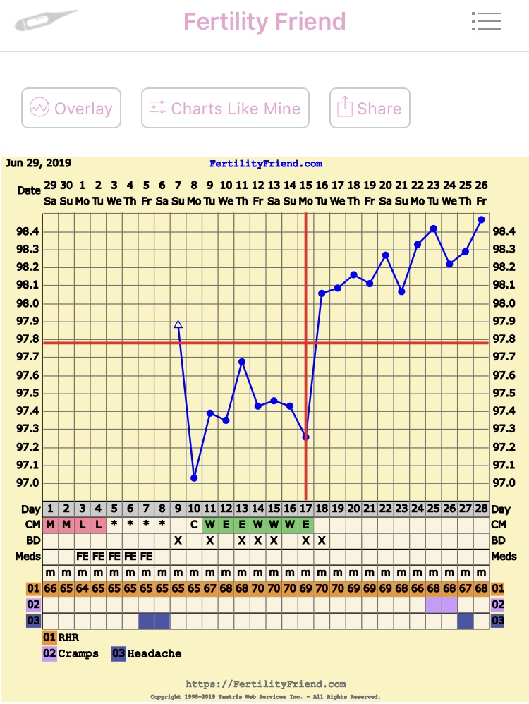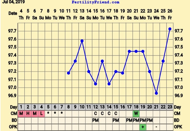 CS/Q: Okay not sure if this is worth sharing (just started temping again, after taking months off, just to see if I would get something that looked like a rise?) I'm thinking O was the 24th based on OPKs, the low temp yesterday could be b/c the A/C was on in our room even though it wasn't hot. Hoping there is a slow rise coming... also it's Ovia, not FF. I might explore with that this weekend...