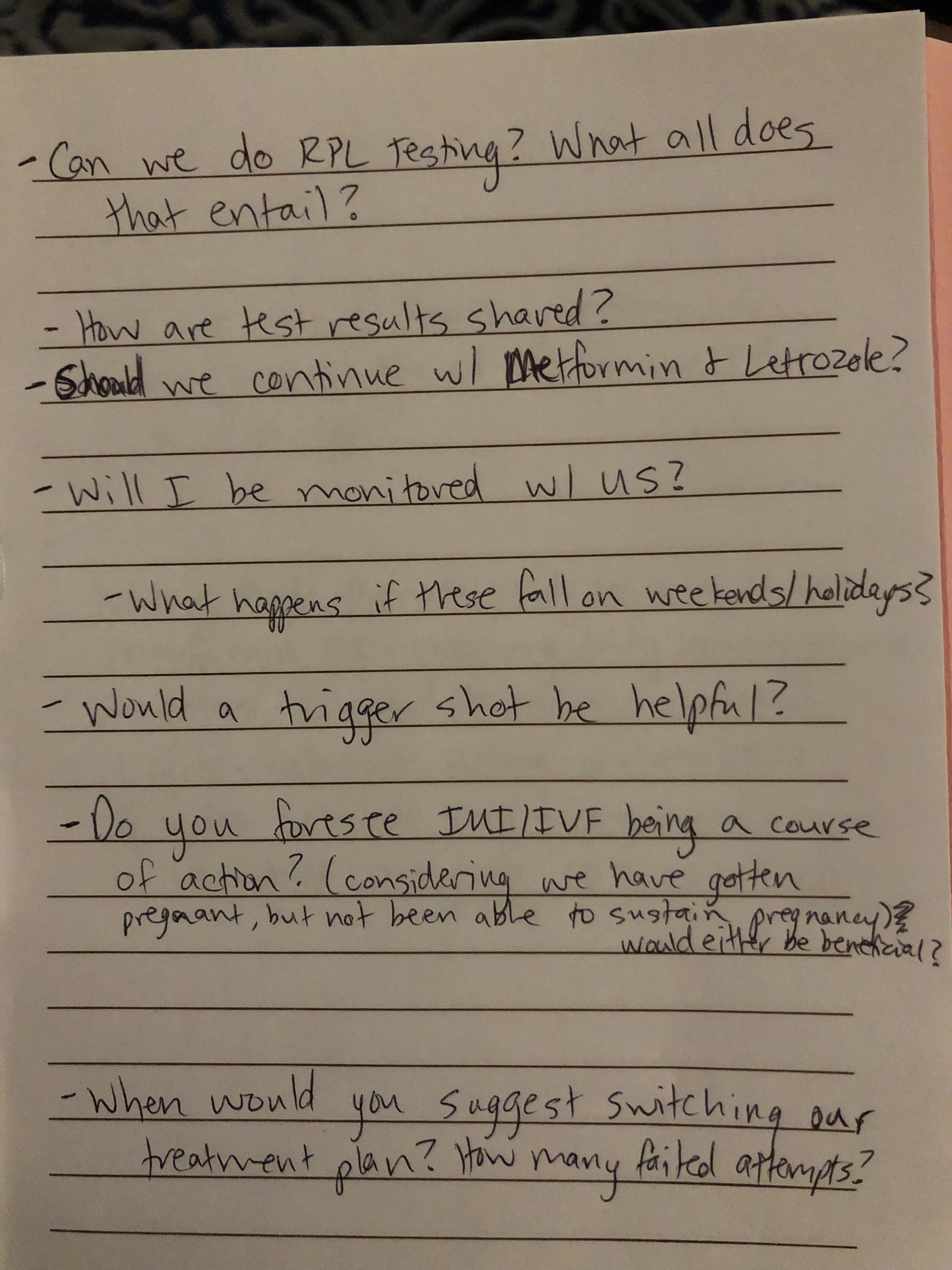 We just got back from the RE appt, and we were both super happy with how it went! The doctor is straightforward and seems super knowledgeable & confident...no warm fuzzies from him, but that’s totally ok. *TW - Since we have gotten pregnant twice fairly quickly (within 3-4 cycles each time), he is keeping meds (Metformin & Letrozole) the same next cycle. Because both those pregnancies ended in losses, we are really looking at RPL testing and figuring out what could be the cause. End TW* I had a lot of blood work done today for RPL...if all of it comes back normal, we will do karyotyping next for both of us (insurance covers it partially, but we want to rule out other stuff first). When I get my cycle, I’ll call to schedule SHG for a week later. We will continue with TI only but add in progesterone after I ovulate (he is a huge proponent of using progesterone). If we don’t get pregnant in 6 months, we may look at trigger and possibly IUI. He didn’t see a point in doing the SA at this point, but would suggest it after 6 months without getting pregnant again. DH is of course relieved! Overall we feel good about the course of action, and hopefully we will have some answers once our testing comes back.