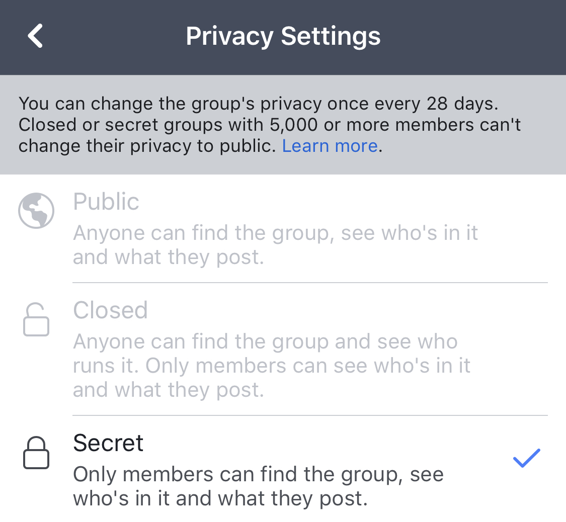 Also, i rechecked what “Closed” meant. No body outside the group will be able to see members or posts or that you've joined the group. So anyone who still hasn’t officially announced is safe once i can change it 🙂
