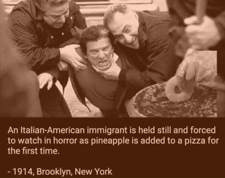 @gingermama29@kpearse99@inthewoods23 The only topping I order on pizza is pineapple!! I dont know why people be hating!!! But in honor of Friday... here's a funny meme (PS I'm Italian)... I almost posted this in the Funnies thread earlier too 🤣🤣