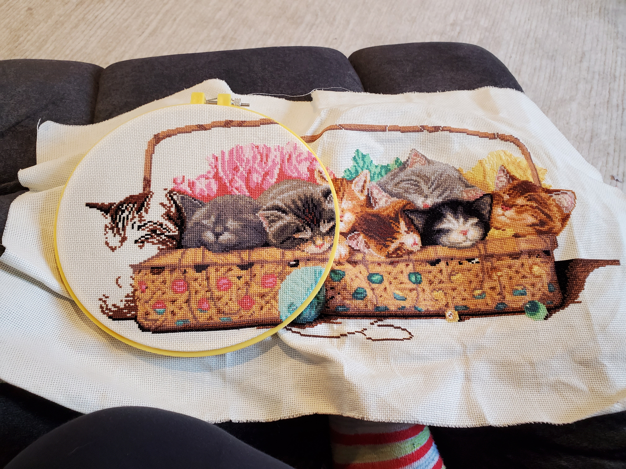 @jackie_dunny it's a really big project with kittens in a yarn basket. Glad you're finally feeling better. Weirdly, I hope it was covid that you just had! Hopefully that means you're immune now or at least significantly lower risk of contacting it ever again. Here's the project I'm working on it you're curious. I've actually made more progress on it since I took this picture yesterday morning