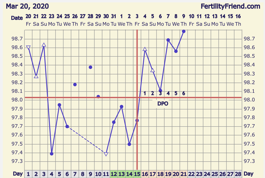 CS/Q: SOLID lines for 9DPO, and a consistent temp creep... weird to O that early, but whatever.