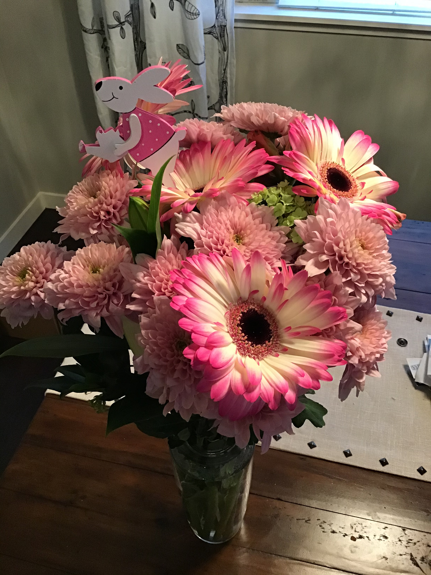 R/R: I’m pretty sure AF is coming soon next week :( My boobs are sore now and heavy etc, like they usually get before I get my period, so that kinda sucks. My day off yesterday was spent pretty much on the couch all day. I wasn’t feeling very well all day yesterday. I was having headaches again all day on and off and feeling dizzy and nauseous like I wanted to throw up and super tired. I have been falling asleep and have no energy really. Just having a general feeling of malaise. Not sure what’s going on or if I’m coming down with something?? 🤷‍♀️ On a positive note, my sweet DH had to make a quick run to the store for stuff for the house and he surprised me with a beautiful bouquet of flowers for Easter. That made my day! ❤️🥰 I love the little wooden bunny in it lol
