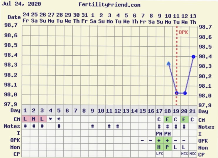 CD: 21. It’s unusually long this cycle because I was on BCP for IF treatment that’s been delayed. I usually ovulate anywhere from CD10-13. Wasn’t temping earlier in month because I was expecting AF, not ovulation.