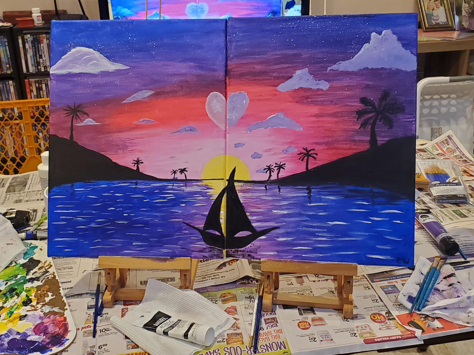 R/R: DH's and my 6th anniversary is this weekend. We have no real plans other than ordering takeout for a date night in. Our last date night in was a paint night; we found a couple's painting tutorial on youtube, painted along with it, and they turned out great. Picture in spoiler if you're curious.