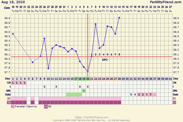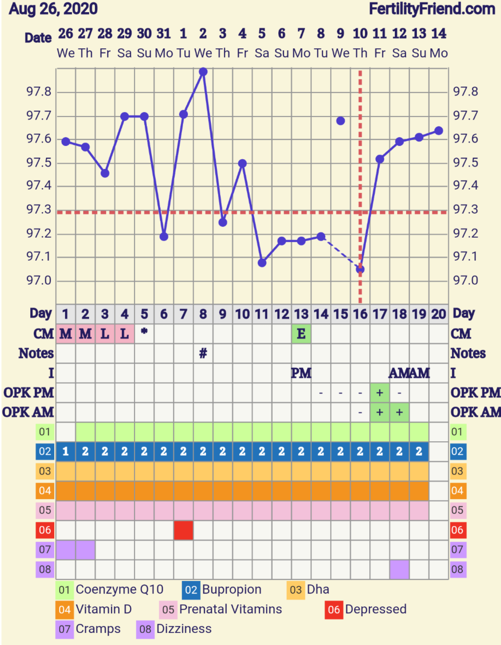 CS/Q: so... I discarded that one high temp so of course I get dotted CH but that was before I even got a positive OPK so........... 🤨 My temps have stayed consistent for like 4 days though so who knows when AF is due