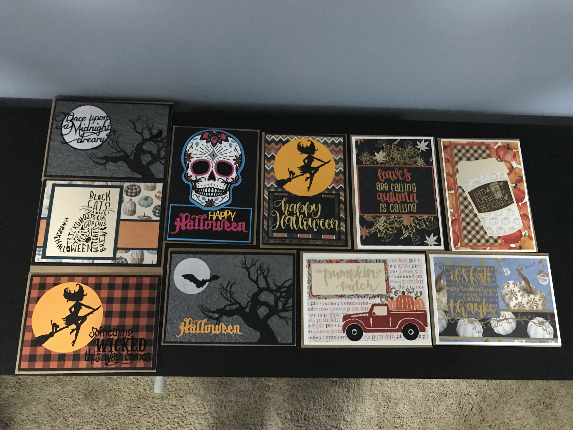I usually do a Christmas card exchange with a group of crafty friends and family, but this year we also decided to do a fall card exchange. The rest of my Halloween/Autumn cards that I finished last night: