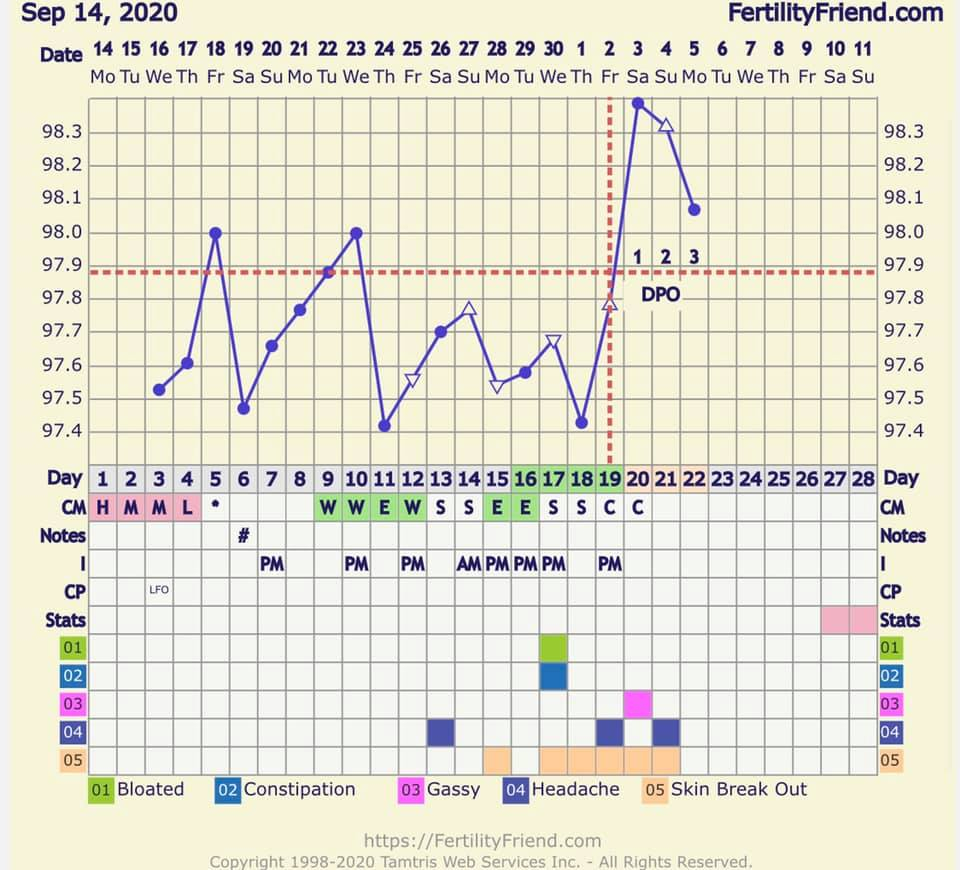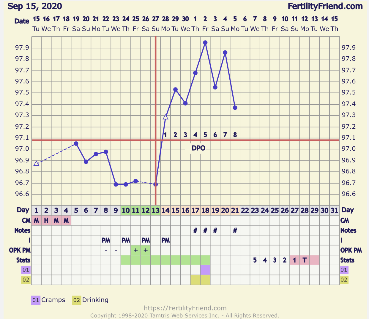 R/R: Today is my wedding anniversary! Since dh and I just bought a house and tons of things for the house we kept it small. We went to a nice Italian restaurant for dinner last night, and had our first date in months! It was very nice! Here’s to 7 years! Besides that, we had a busy weekend packing, doing ground work and working. The weather is starting to cool off here and it’s affecting my temps a lot. Nothing crazy SS wise, Had some mild cramping all morning on Friday at 5dpo, so maybe that means something good? I don’t know.