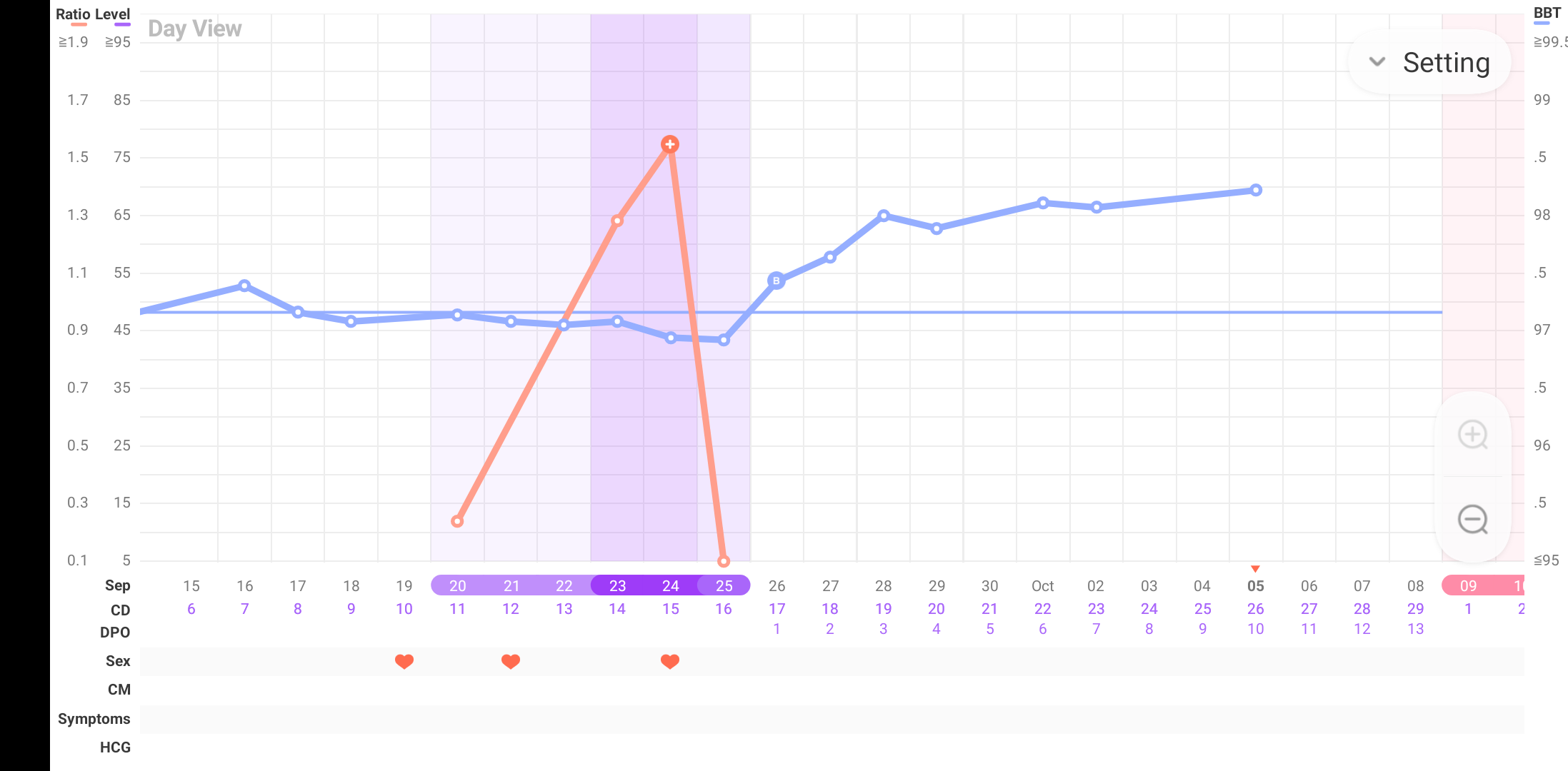 R/R: FF finally gave me crosshairs on my chart on cd19 which I was surprised to see this morning. I think cd18 is more realistic though. I wish we had hit -1, but I don't think our timing is too bad. I have never O'd this late, so I don't really know what to expect. AF is supposed to come on Saturday (8dpo), so I will probably wait until then to test at the earliest.