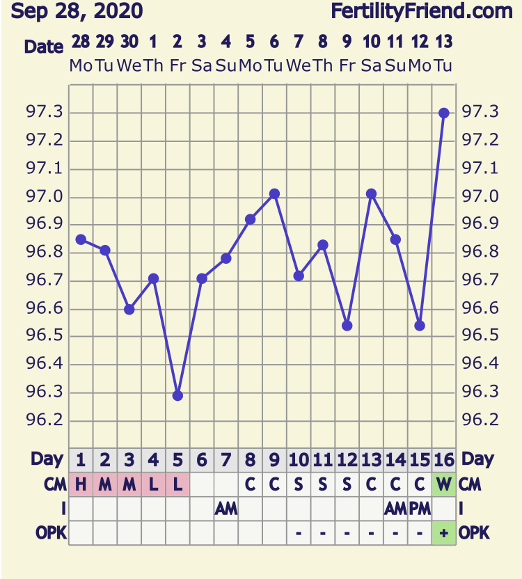 CS/Q: Just to be confusing, temp is up today but OPKs were not positive until this morning. I’m not sure what to make of that as far as tracking, but I think I’m ovulating today?