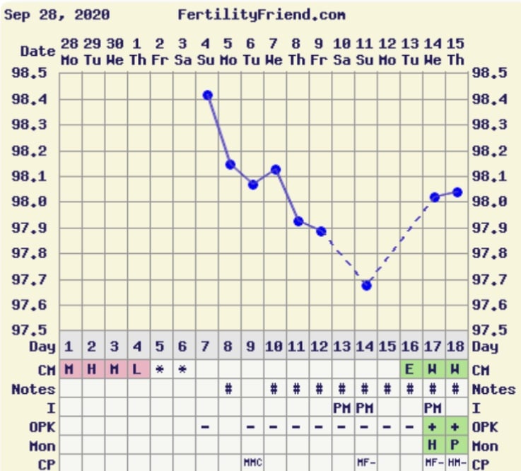 CS/Q: Despite the positive OPKs & CM pattern, no matter how many future high temps I enter, FF still won’t give me cross hairs. I guess I missed too many temps while we were traveling earlier this week. I will have to put in a fake temp or two to get confirmation from FF once I finally O tonight or tomorrow. As long as I remember to temp at the same time the next few days I should be able to confirm it easily myself.