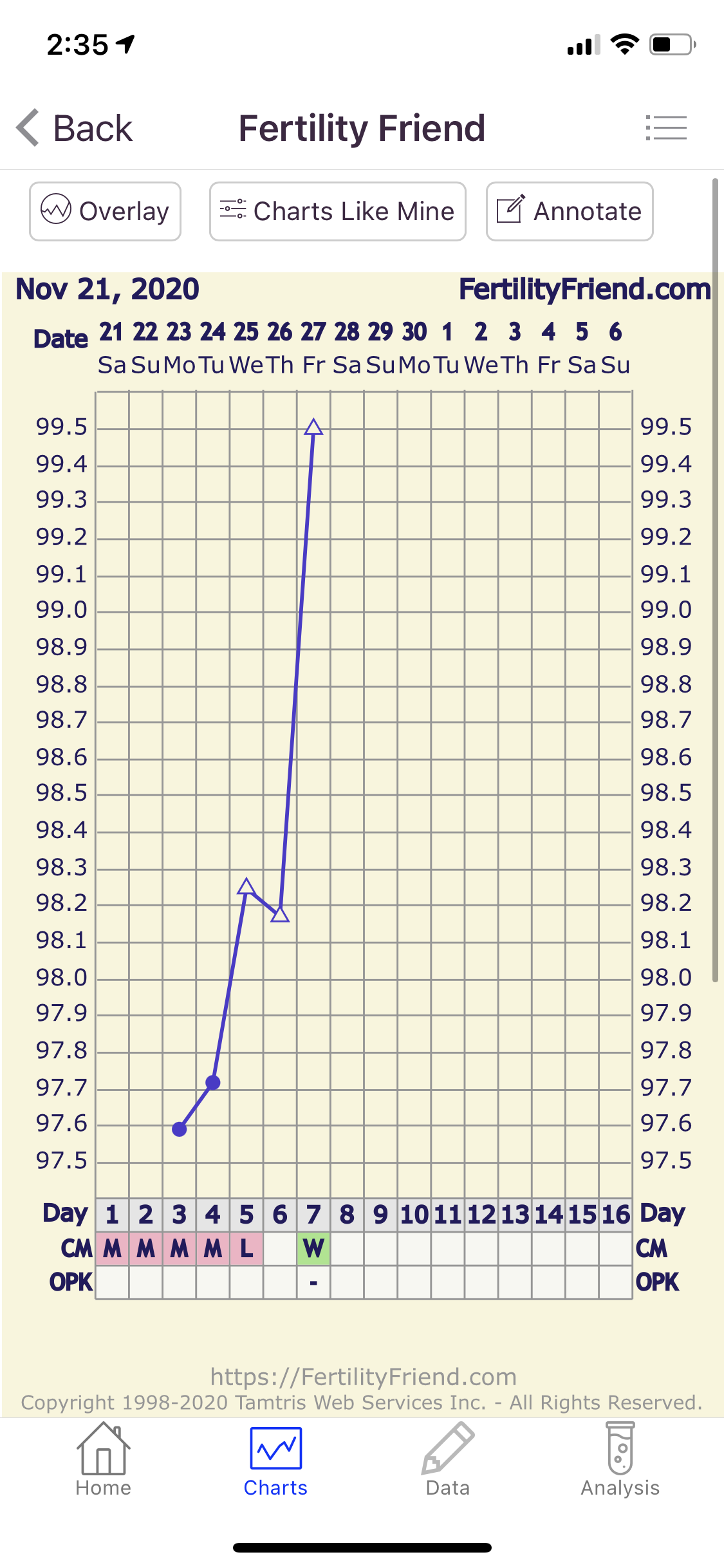R/R: well, my bbt is in the trash. I have this sinus thing going on and my temp spiked to 99.5. I went ahead and took an opk, bc we were thinking maybe I O right when I get off my cycle, but it was negative today. I’ve never done opks before.