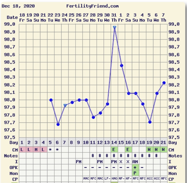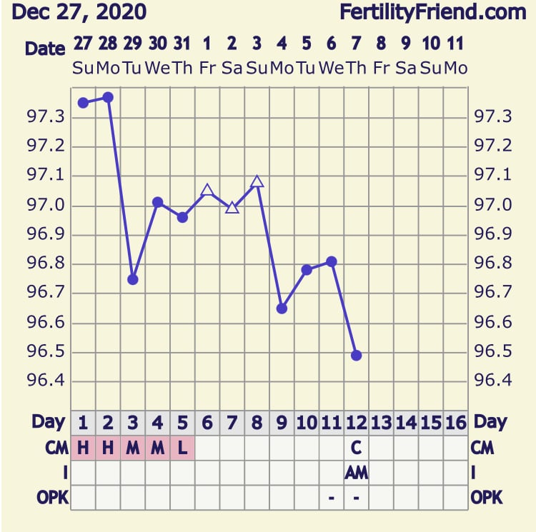 CS/Q: Temp was weirdly low this morning, which made me think I may ovulate early (I have frequently had a temp dip right before) but OPK still only at baseline.