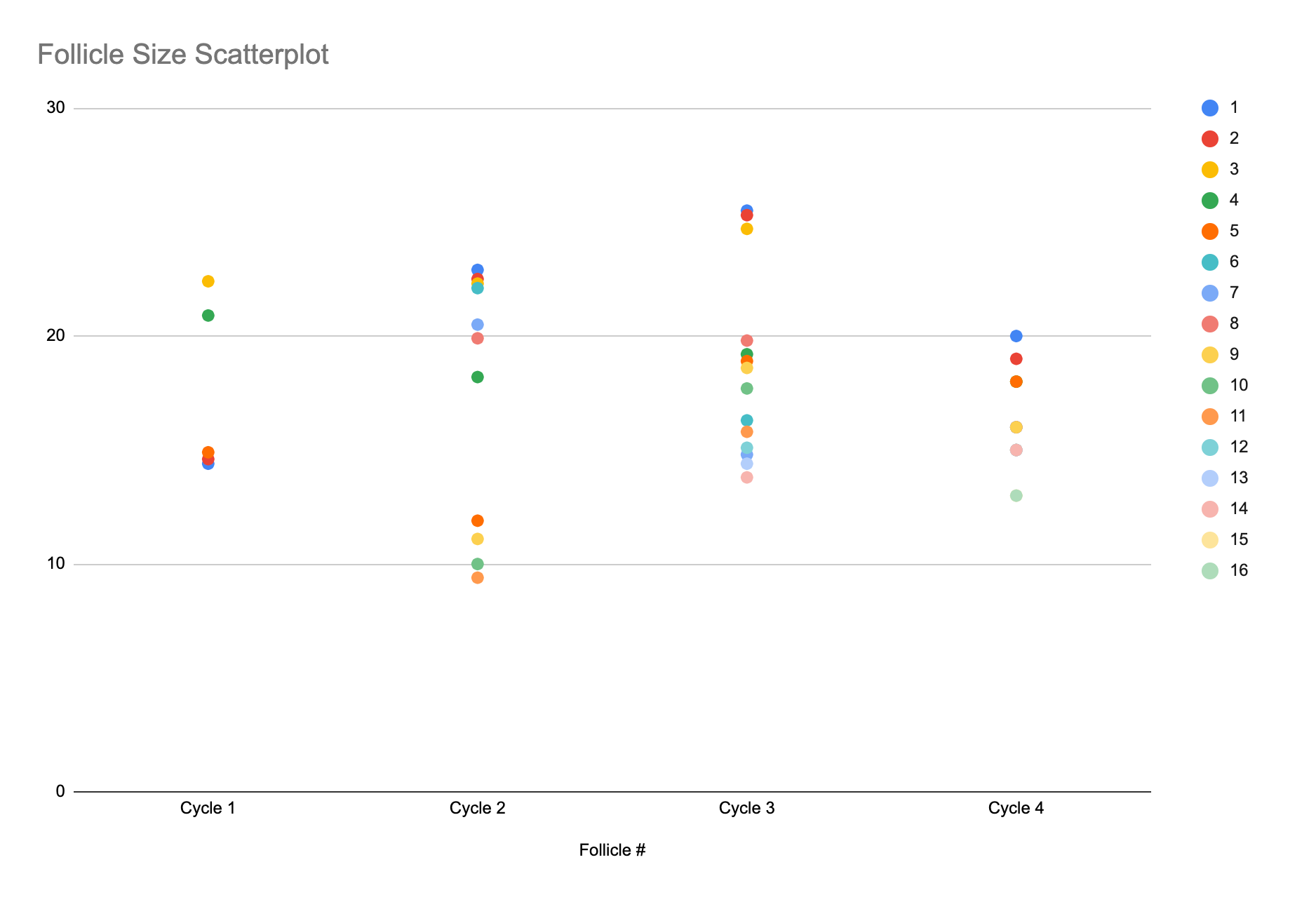 In terms of you being uneven responder, once again, this cycle is an opportunity to learn how your body reacts. There are definitely ways to sync your follicles into more even production through changes to protocols. Just this past weekend, I helped a friend compile data on her 4 ER cycles. Graph included in spoiler. 2 things to notice: 1) each cycle, she had more follicles / eggs; 2) each cycles the growth was more in sync. The last cycle isn't very visible, but she had 16 follicles in that one (14 eggs retrieved) with the range being 7mm. That last cycle she did in a different clinic, but that clinic took the learnings from the 3 previous cycles to create the right protocol for her (she also had DOR).