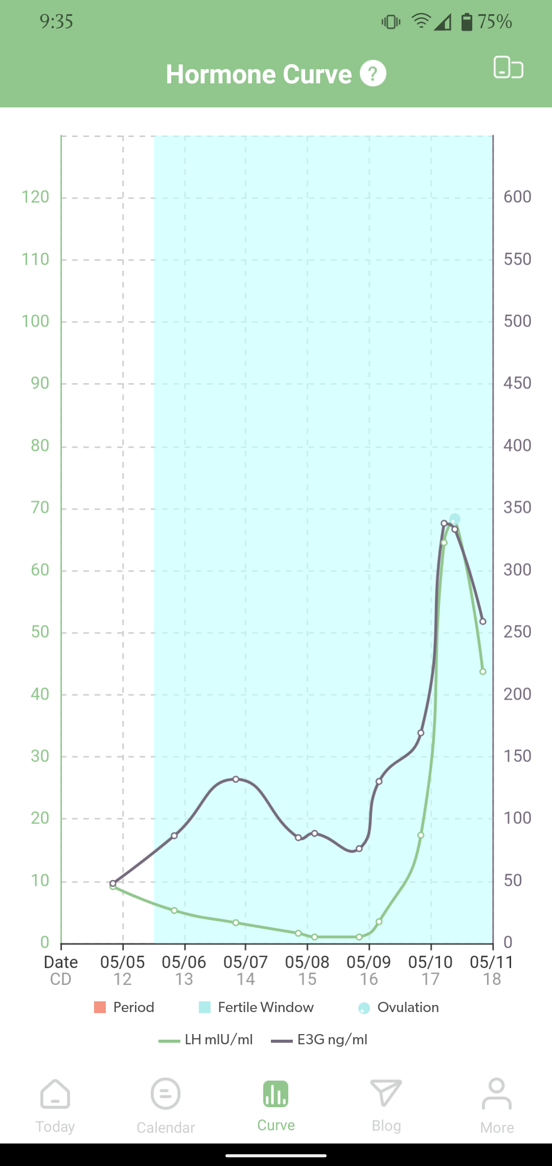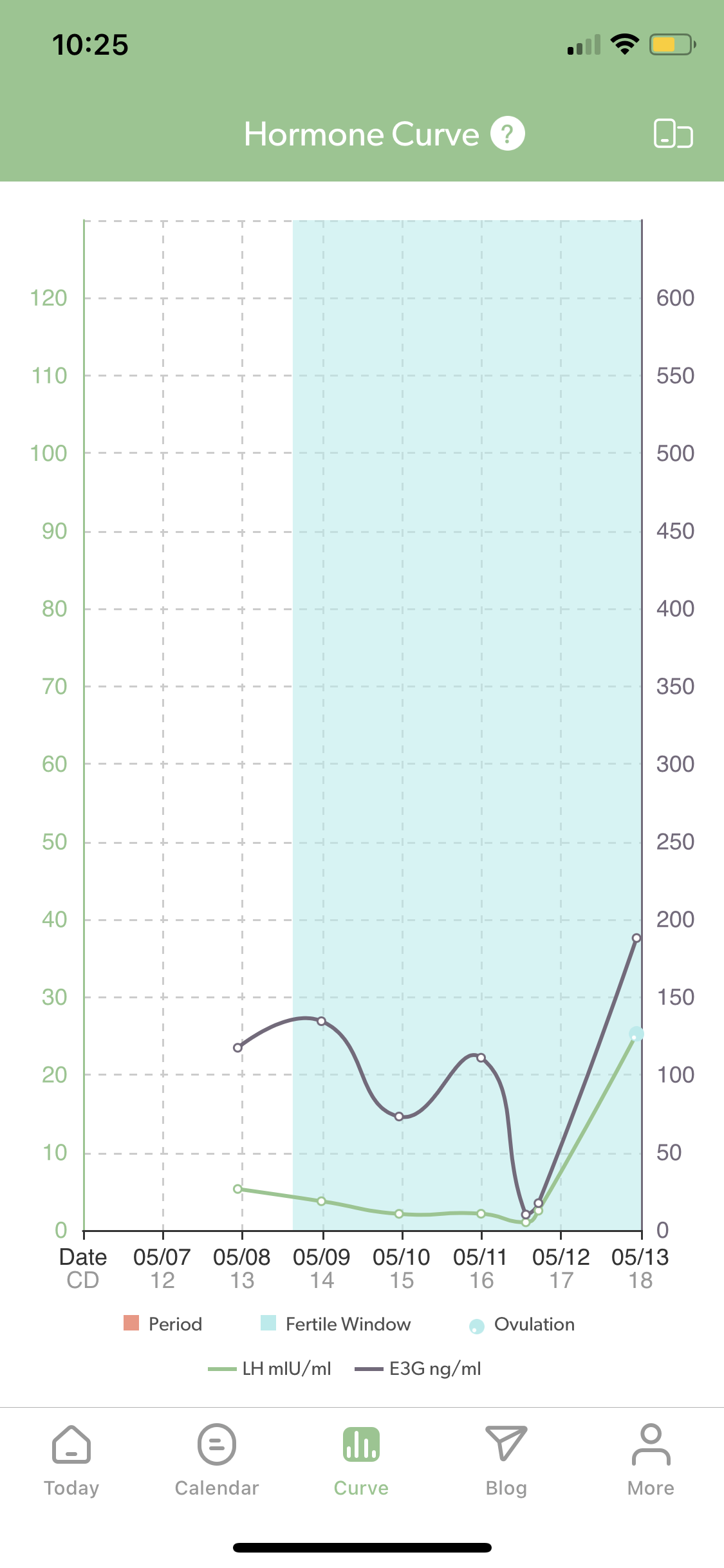 CS/Q: this is my first month using the Mira analyzer. I’ve struggled this week because it keeps showing O on different days. In the grand scheme, we’ve HIO EOD in the fertile week so that’s not bad just wish I had an idea about whether we hit O. Mira says O is today, but I think it could be tomorrow, too. Chart below shows a peak as of this morning (the earlier peak and crash is what confused me). Thoughts? Wouldn’t O more likely to be tomorrow if the peak is this morning?
